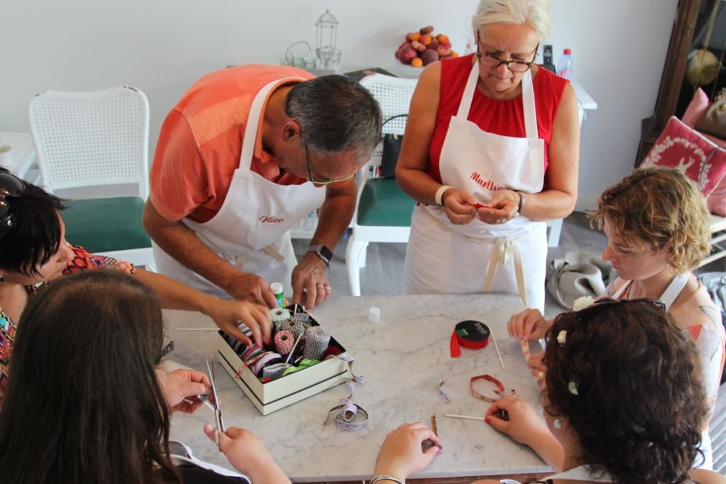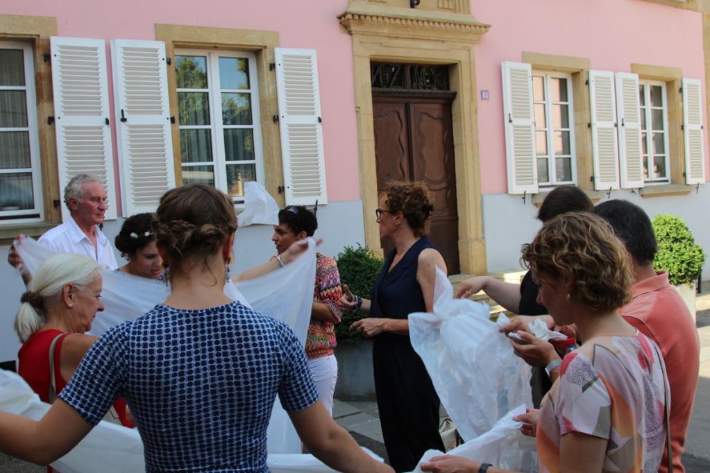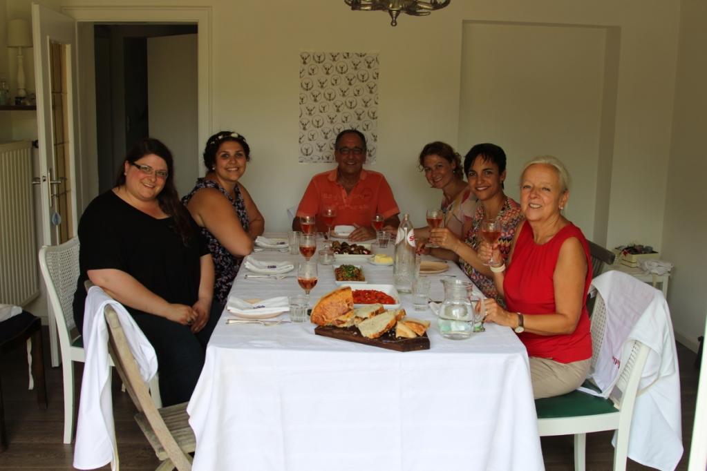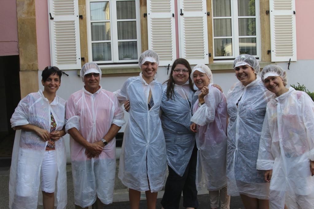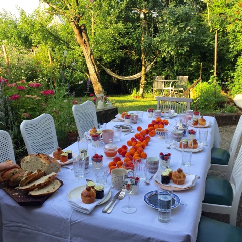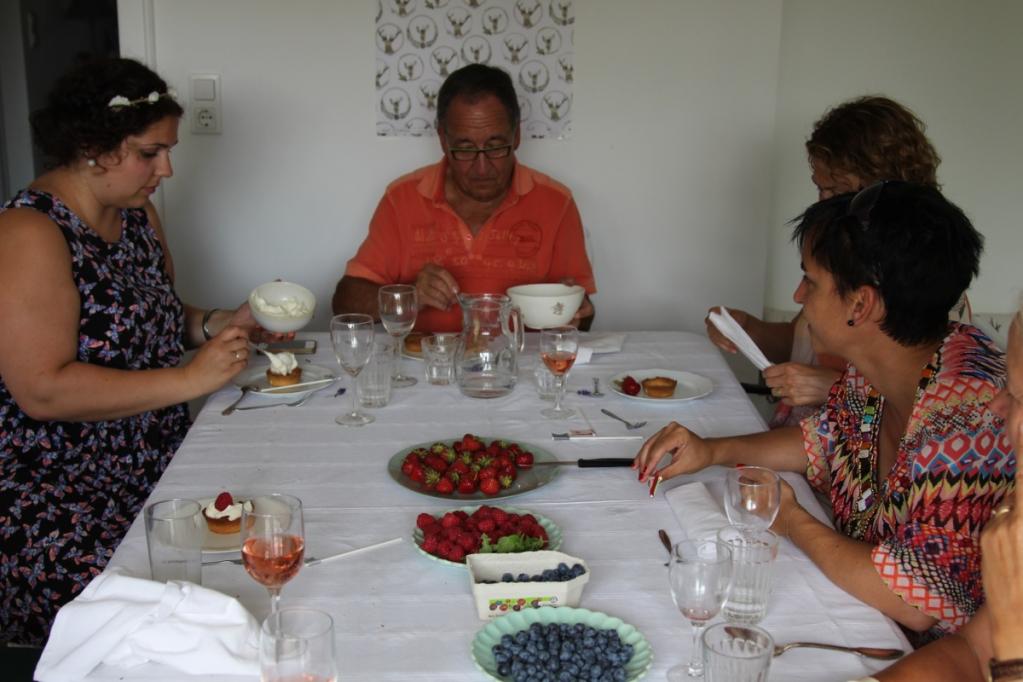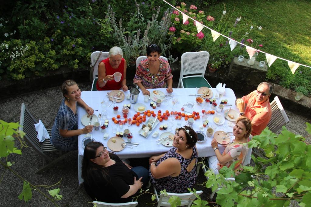 Der 04. Juli ist ein heißer Sommertag und ich stehe schon um halb sechs auf um alles vorzubereiten. Auf der Terrasse baue ich eine lange Tafel auf und dekoriere sie in der Mitte mit aromatischen Aprikosen aus der Provence. Manchmal sind die einfachsten Dekorationen die Schönsten! Meine gestrickte Lieblingswimpelkette wird zwischen dem Baum und dem Balkon befestigt und sorgt unmittelbar für Ferienstimmung im Garten! Zum Frühstück gibt es selbstgebackenes Brot, Brioche, selbstgekochte Aprikosen- und Heidelbeermarmelade, französischen Käse, Brioche und ein Gläschen Champagner! Danach fahren wir alle zusammen nach Fentange in die Luxemburger Mozarella Manufaktur.