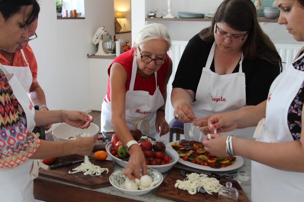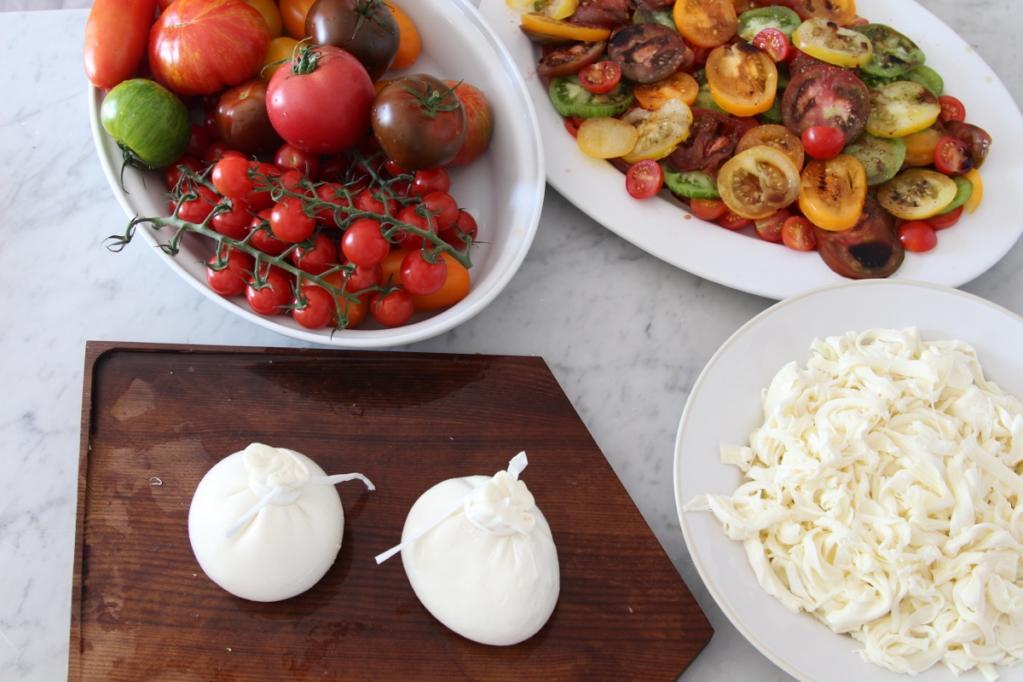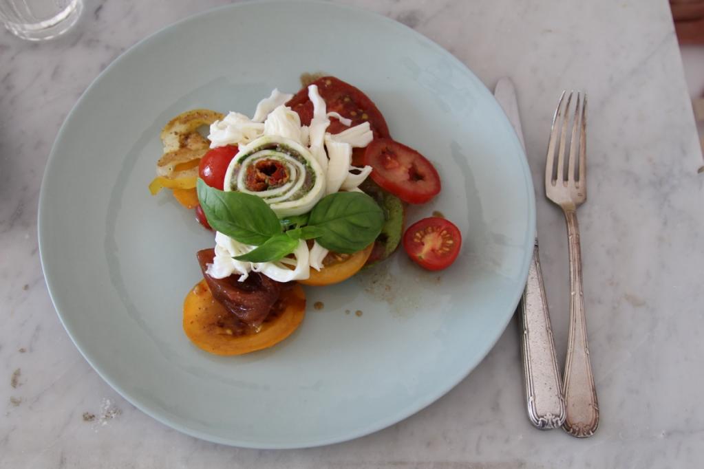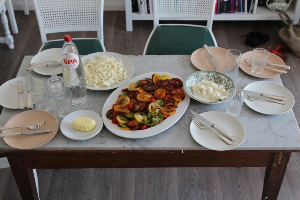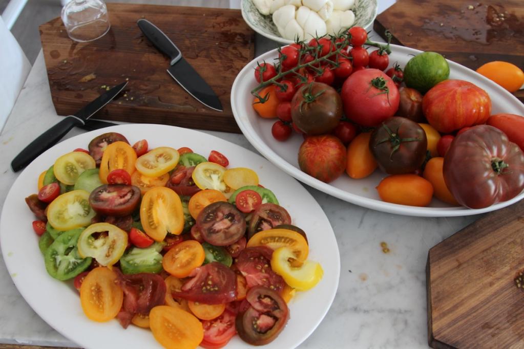 Zuhause in der Küche wartet bereits eine große Schüssel bunter Tomatensorten auf uns. Gemeinsam zu Kochen und Genießen macht einfach glücklich! Erst schneiden wir grün gestreifte, orangene längliche, gelbe runde und kleine rote Tomaten in feine Scheiben, begießen sie mit ein wenig Olivenöl und geben zum Schluss noch etwas Fleur de Sel und frischen Pfeffer aus der Mühle darüber. Dazu gibt es, na klar, frische Mozzarella und selbstgebackenes Brot! Außerdem machen wir eine Rolle aus Mozzarellateig, selbstgemachter Basilikumpesto, getrockneten Tomaten, Parmaschinken und Basilikum! Wenn das kein italienischer Sommer ist.....