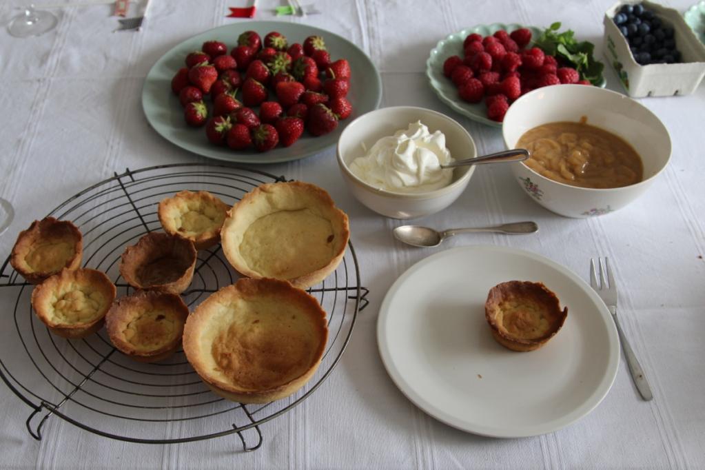 Knuspriges Mürbeteig-Sahne-Törtchen mit Bananen-Karamell und frischen Früchten