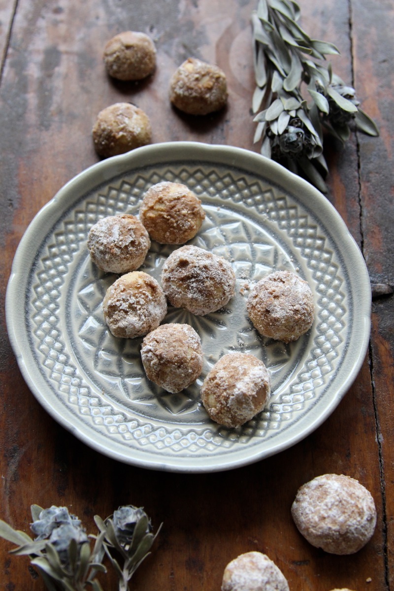 Die Walnüsse in einer Pfanne leicht rösten, danach abkühlen lassen. Die Butter kleinwürfeln. Alle übrigen Zutaten zur Butter hinzufügen und fein krümelig vermischen. Die Krümel rasch zu einem Teig zusammenfügen. Den Teig zu einer Rolle forme, in 1 cm dicke Scheiben schneiden und diese zu kirschgroßen Kugeln formen. Die Kugeln auf ein Blech mit Backpapier legen und 30 Minuten kühl stellen. Den Backofen auf 150 °C vorheizen. Das Gebäck 20-25 Minuten backen. Den Puderzucker mit dem Zimt vermischen und die noch leicht warmen Kugeln darin wälzen. In einer luftdichten Dose aufbewahren.