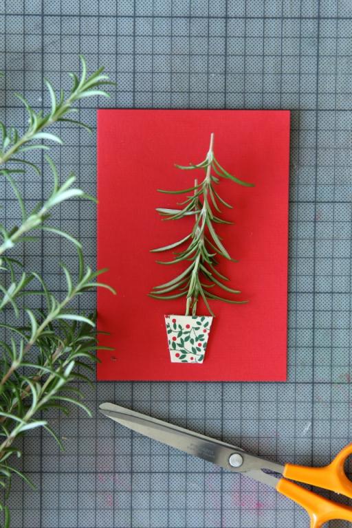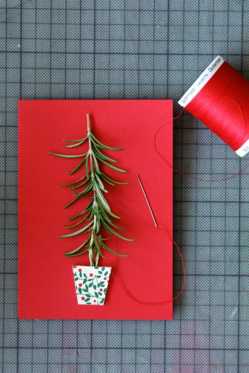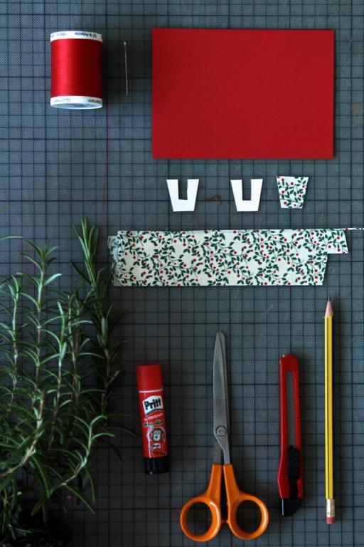 Für diese Karte brauche ich eine stabile Doppelkarte aus Papier. Außerdem einen Streifen schönes bedrucktes Papier, das ich als Verstärkung auf eine feste Pappe klebe. Hieraus schneide ich die Außenseite für den Topf. Für die Unterseite des Tannenbaumständers verwende ich aus Pappe zwei gleiche Stücke in der Form eines Topfes mit ausgeschnittener Einbuchtung für das Bäumchen. Mit einem Cutter auf einer Cuttermatte geht das Schneiden am Besten. Einen Klebestift zum Befestigen des Topfes, Rosmarinzweige für das Bäumchen und Nadel und Faden in der Farbe der Karte.