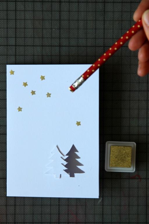 Für den Sternenhimmel verwende ich ein goldenes Stempelkissen. Den selbstgebastelten Stempel erst in das Stempelkissen drücken und dann leuchtende Sterne in den Himmel über dem Tannenwald stempeln! Ein kleiner Tipp: Das Stempelkissen nach dem Öffnen mit dem Deckel nach unten lagern, so bleibt die Farbe an der Oberseite.