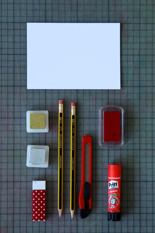 Für diese Karte brauche ich eine weiße Doppelkarte aus Papier, ein farbiges Stempelkissen, einen Cutter, eine Cuttermatte, Bleistift und Klebestift.