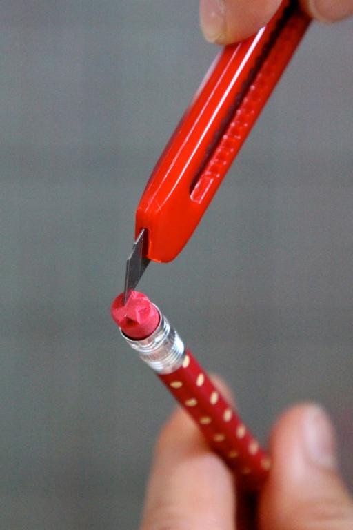 Aus dem Radiergummi eines Bleistiftes lässt sich ganz einfach ein Stempel herstellen. Dafür mit einem Cutter vorsichtig die Ecken für einen Stern ausschneiden.