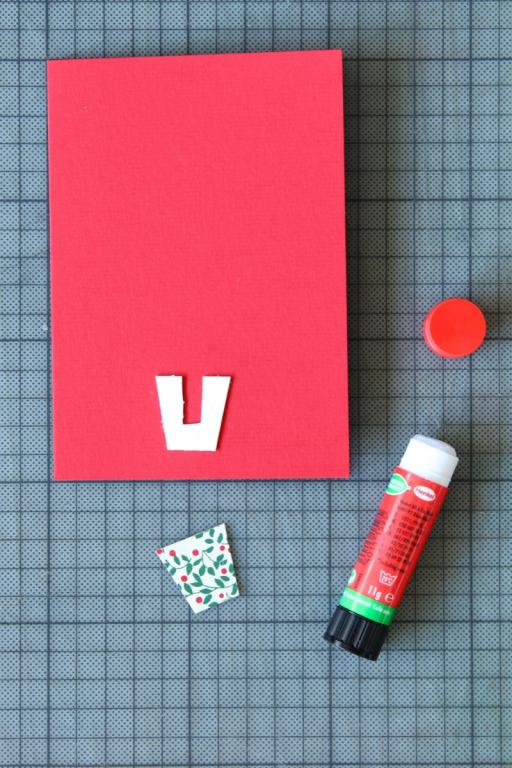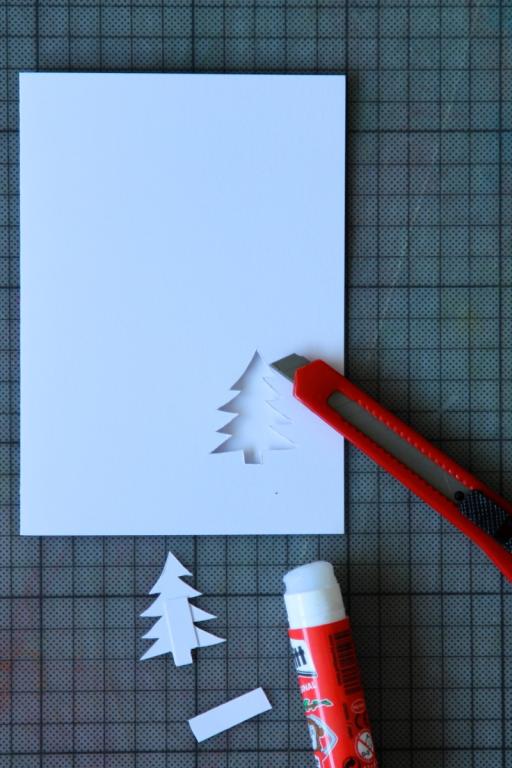 Mit einem Bleistift zeichne ich auf der Karte erst einen Tannenbaum vor und schneide ihn dann mit dem Cutter vorsichtig aus. Den Stamm des ausgeschnittenen Tannenbaums verstärke ich auf der Rückseite noch mit einem Schnipsel Pappe und klebe ihn dann mit dieser Seite versetzt zum ausgeschnittenen Baum. So entsteht ein verschneiter Tannenwald!