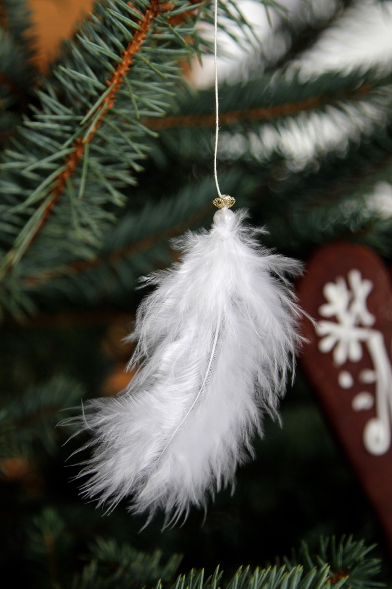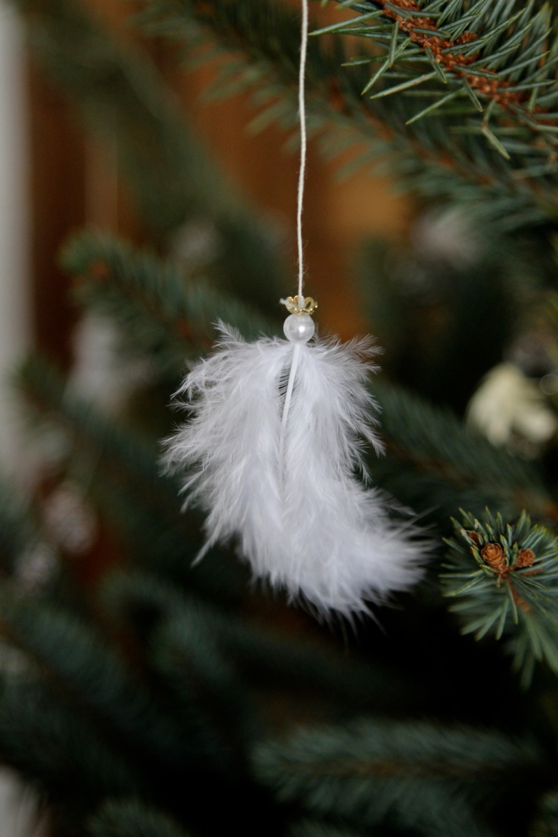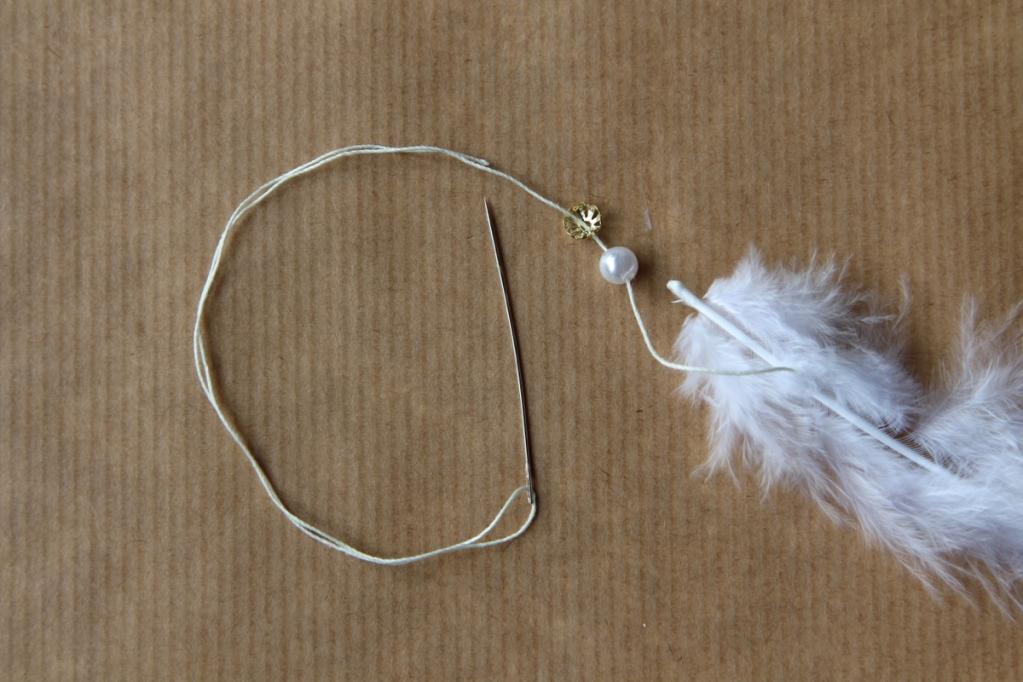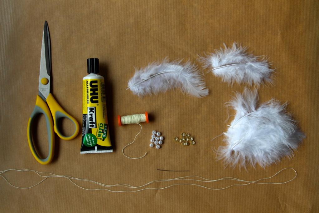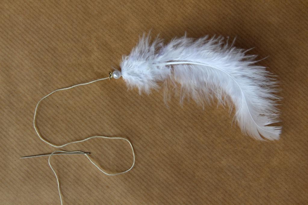 Ihr braucht: weiße Federn, Perlen mit einem Loch, goldene Perlenfassungen, Faden, Nadel und Flüssigkleber.