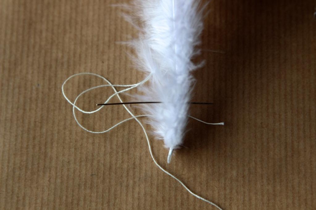Als erstes macht ihr einen Knoten in das Fadenende und fädelt den Faden mit einer Nadel durch die Federspitze.
