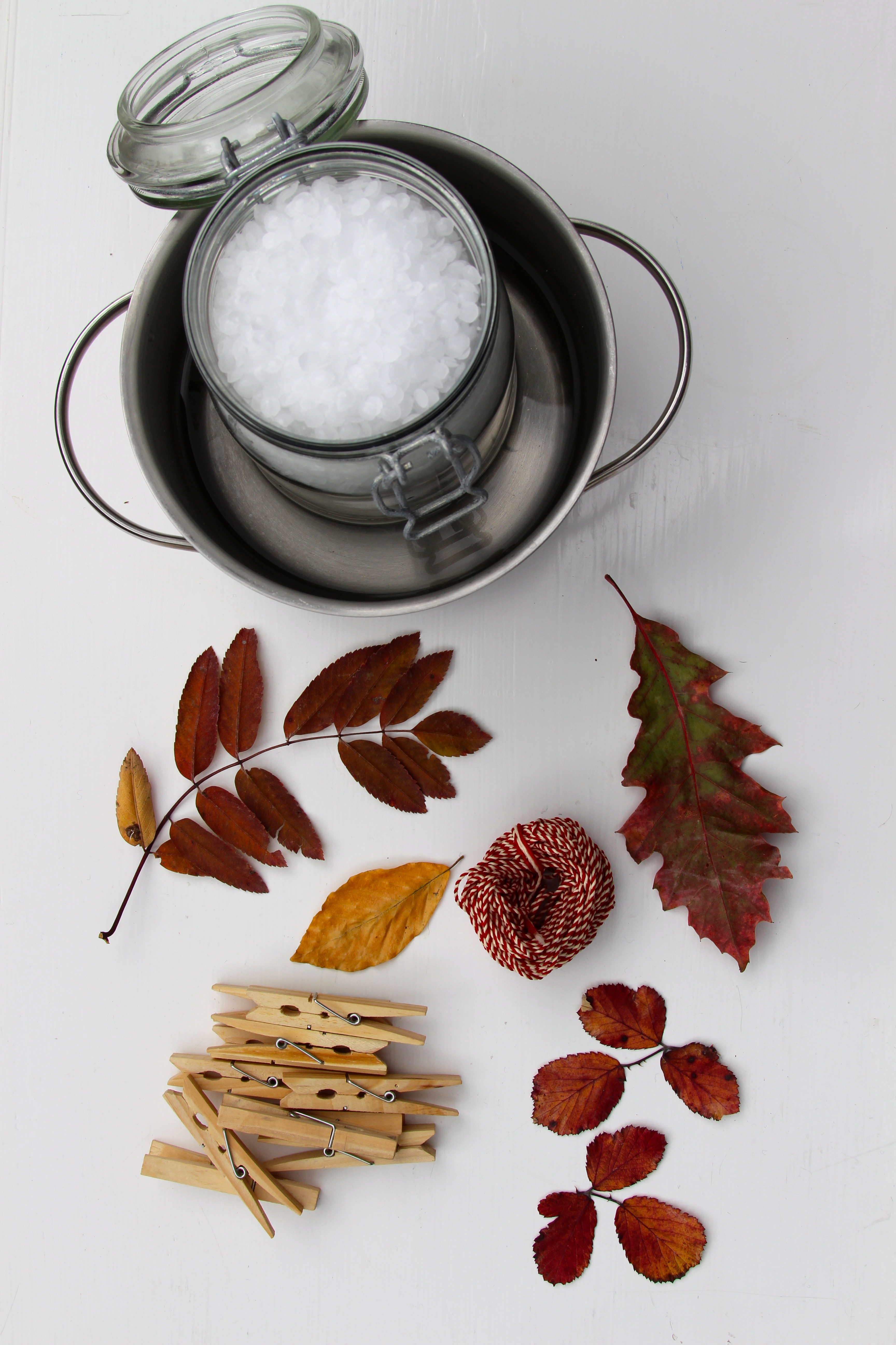 Zum Konservieren der Blätter verwende ich eine besonders prächtige Auswahl bunt leuchtender, glatter Herbstblätter (evtl. pressen), Wachsgranulat aus dem Bastelladen, ein großes Glas oder eine Dose, einen Topf, Schnur und Klammern.