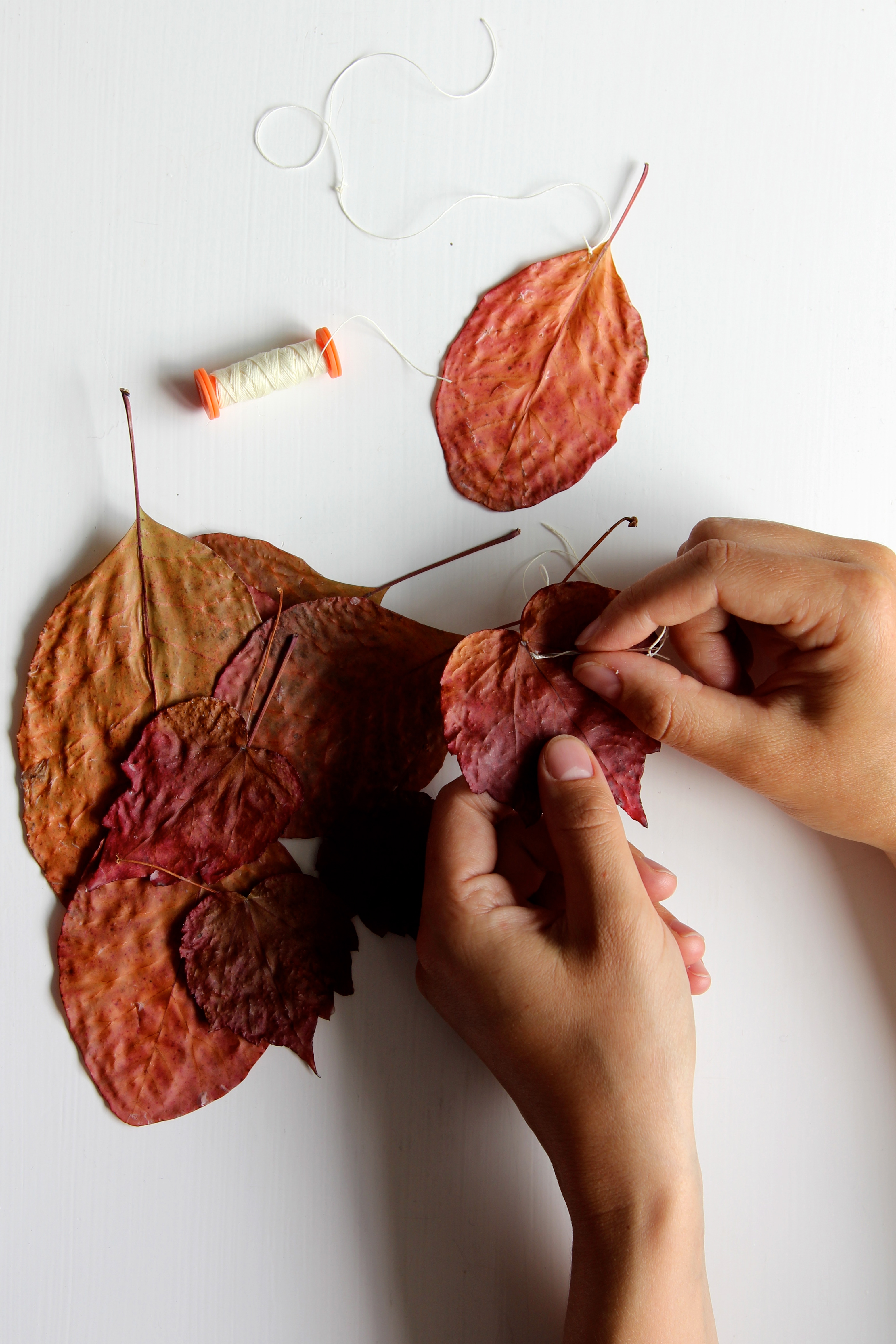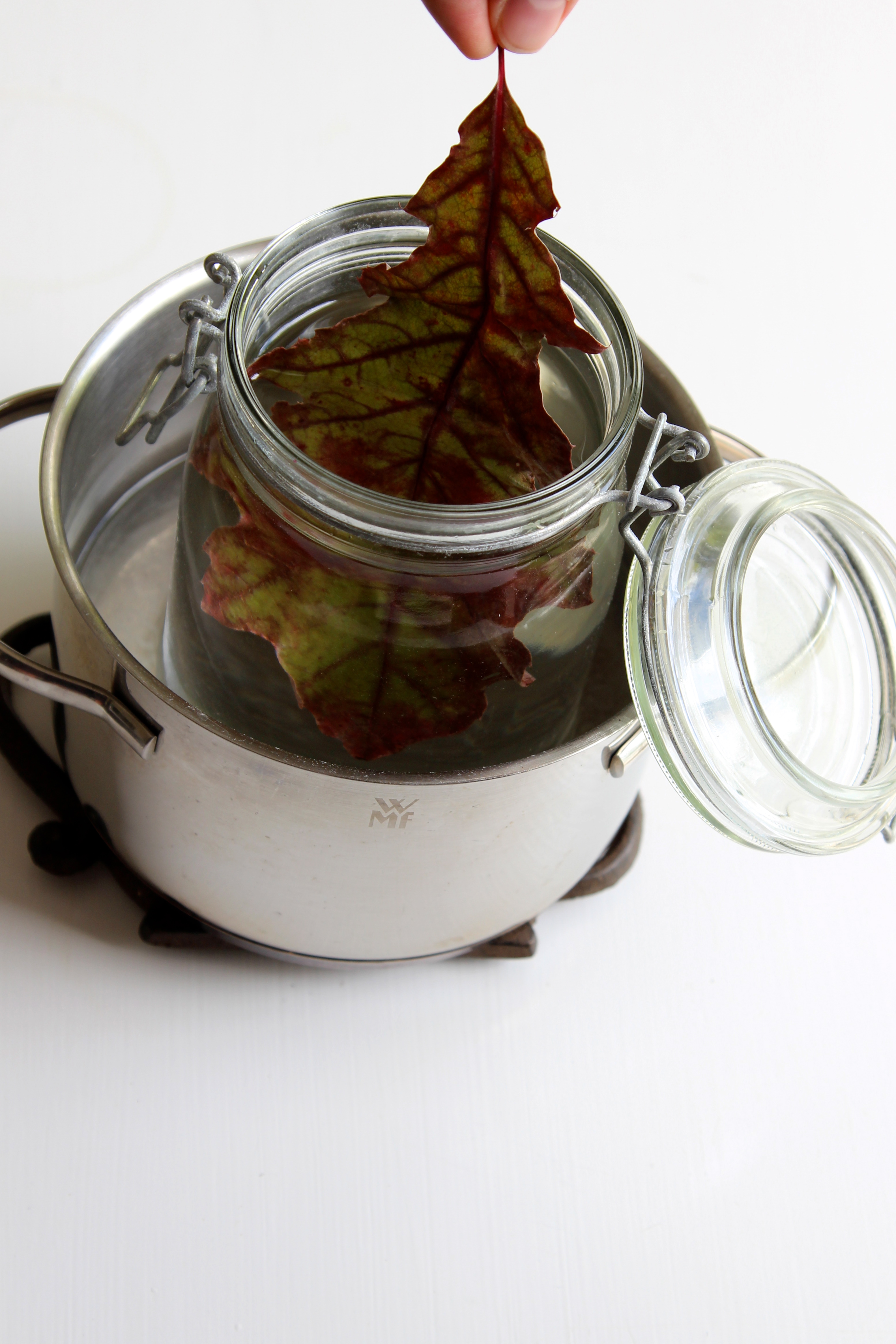 Das Wachsgranulat in einem Glas im kochenden Wasserbad schmelzen lassen. Danach die Blätter mit dem Stiel in das flüssige Wachs tauchen. Nach dem Tauchgang die gewachsten Blätter zum Trocknen kurz an eine Schnur klemmen. Danach können sie mit einer feinen Nadel und einem dünnen weißen Faden zum Aufhängen eingefädelt werden.
