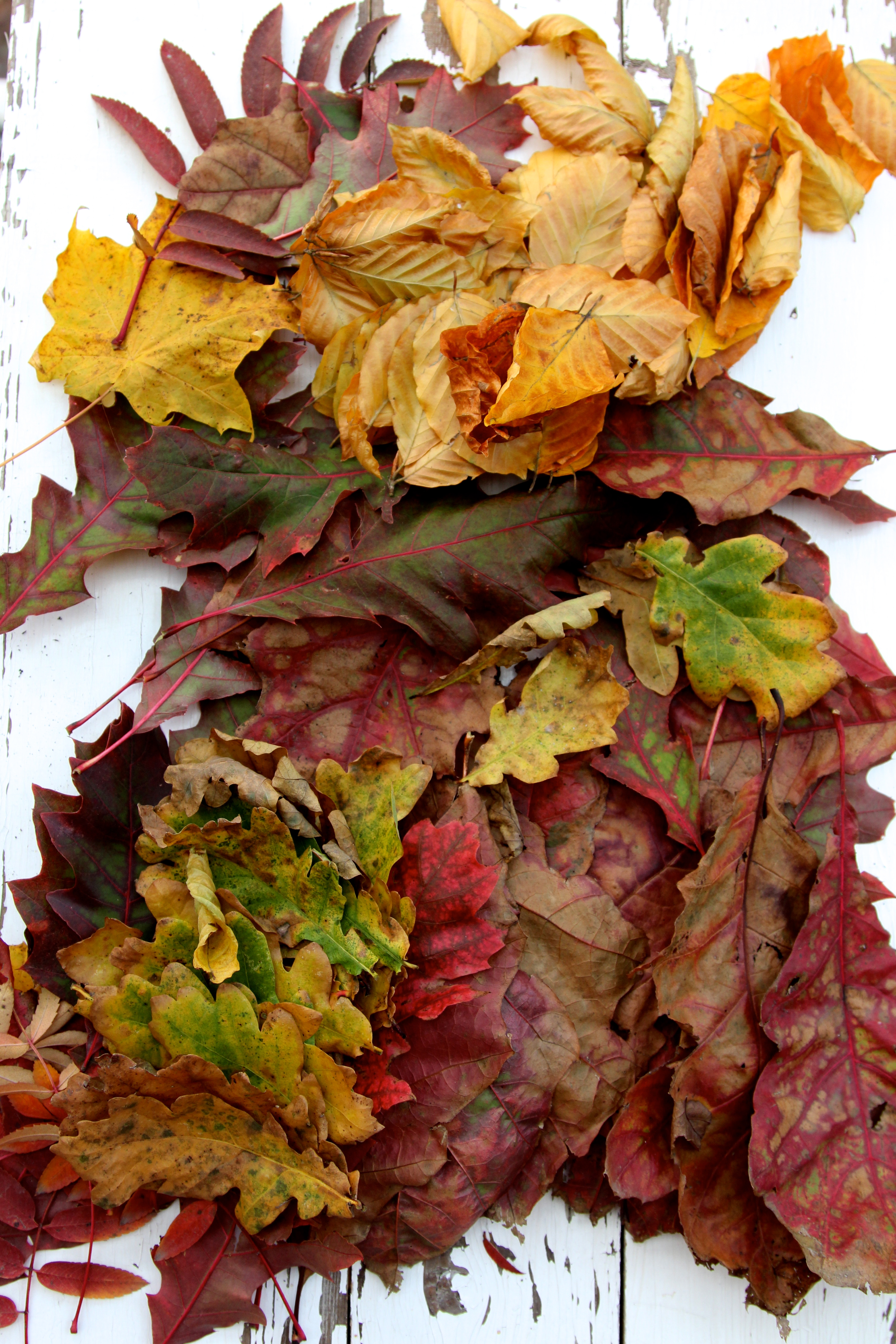 Im Herbst färbt sich jetzt der Wald in den schönsten Farben. Wenn dann das Licht der Abendsonne durch das Blätterdach fällt und die Bäume in einen warmen Goldton taucht, ist der beste Moment für einen Spaziergang! Die Lederstiefel rascheln beim Gehen im Laub und in die Nase steigt der unverwechselbare Geruch trockener Laubblätter. Oh welch ein Fest für die Sinne! Die schönsten Exemplare pflücke ich direkt vom Baum und lege sie in der Hand vorsichtig übereinander. Mit einer zarten Wachsschicht überzogen behalten die Blätter übrigens ihre schöne Farbe und Struktur!