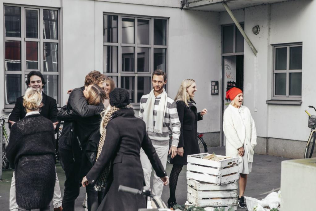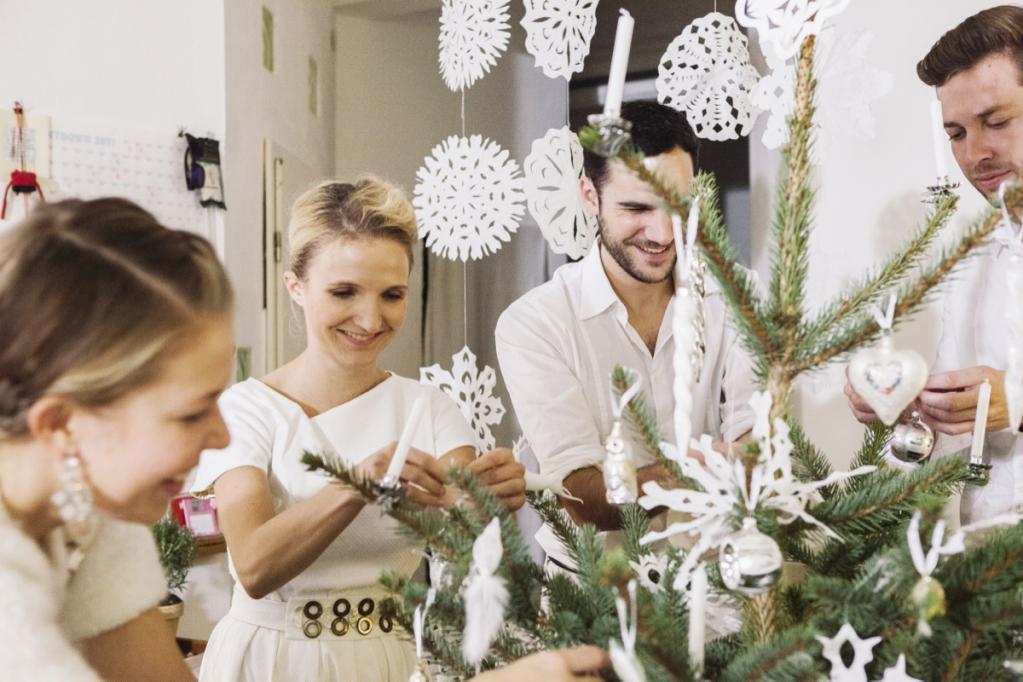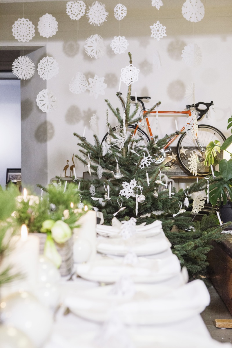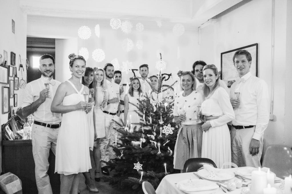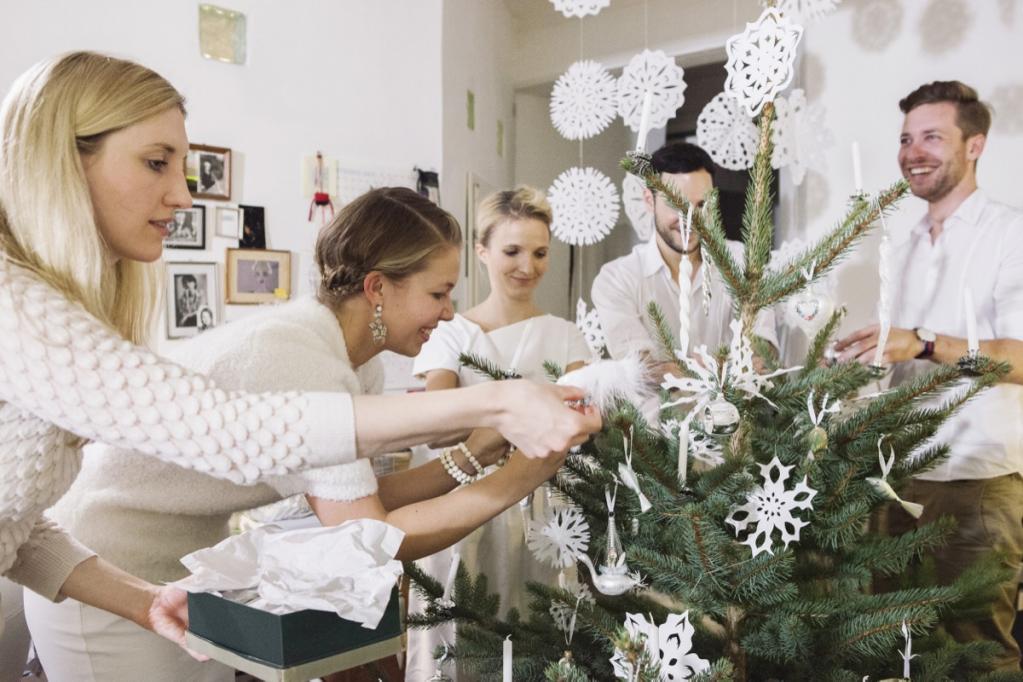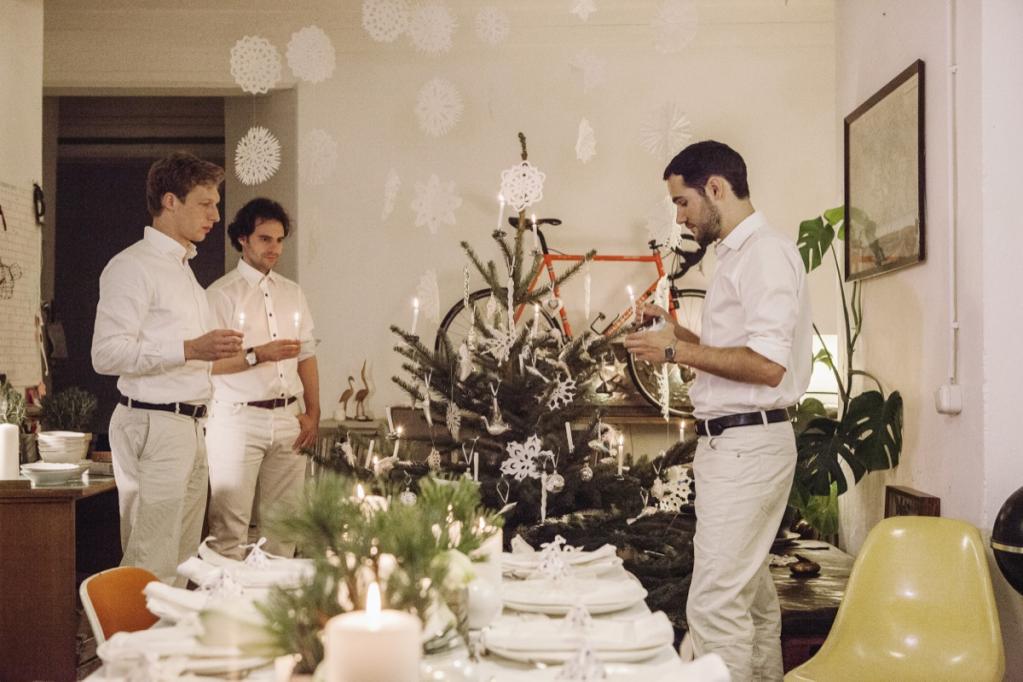 Antonia, Amelie und Carolin kommen schon einen Tag früher! Auf dem Tannenhof Meier im Auetal in Bliedersdorf suchen wir gemeinsam unseren schönsten Baum aus und trinken in der Holzhütte heiße Schokolade mit Zimt und Sternanis. Von dort hat man eine wunderschöne Sicht, es ist ein besonderer Ort zur Vogelbeobachtung! Am nächsten Morgen ist es dann soweit: Alle sind angereist! Aus Paris, Luxemburg, London, Wien, Berlin, Bamberg, Köln, München und Mannheim! Welch ein Wiedersehen! Alles ist bereits in Kisten verpackt und wir tragen sie inklusive Baum die schmale Treppe hoch, bis zum 3. Stock! Ist das eine Gaudi! Ich habe mich schon lange auf diesen Moment gefreut. Der Baum steht und dann wird gemeinsam geschnibbelt und gekocht, gebastelt und dekoriert! Gudrun hat vom Weihnachtshaus ihrer Mutter in Husum wunderschönen weißen Christbaumschmuck mitgebracht. Der schönste Gänsehaut-Moment (leider nicht im Film, aber ihr könnt es euch vorstellen!): Alles ist fertig, der Crémant perlt in den Gläsern, die Kerzen am Baum brennen und wir singen alle gemeinsam O Tannenbaum! Dann ist Weihnachten!
