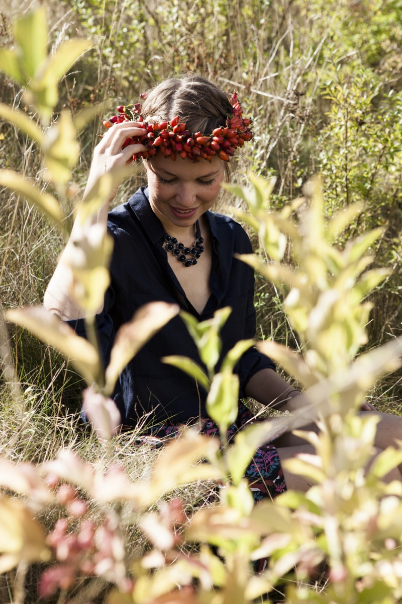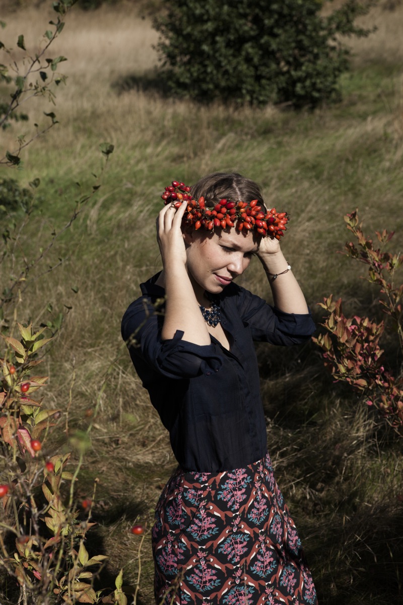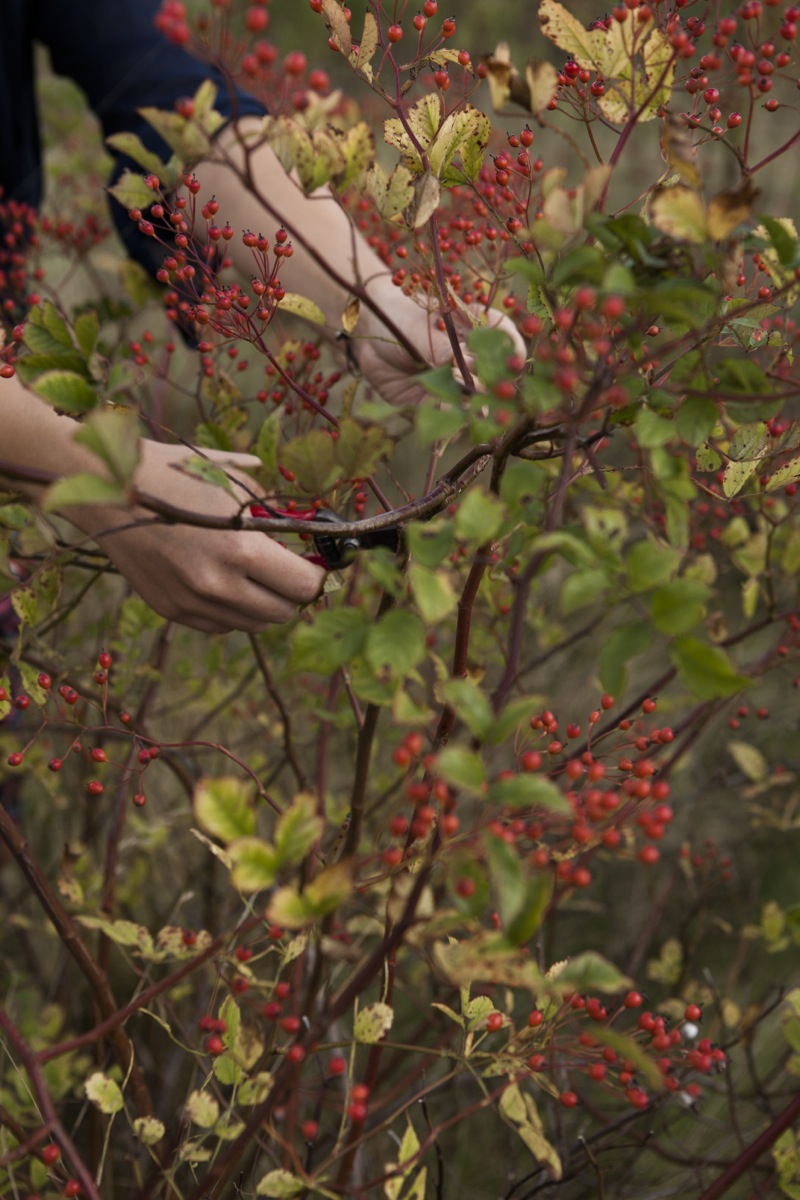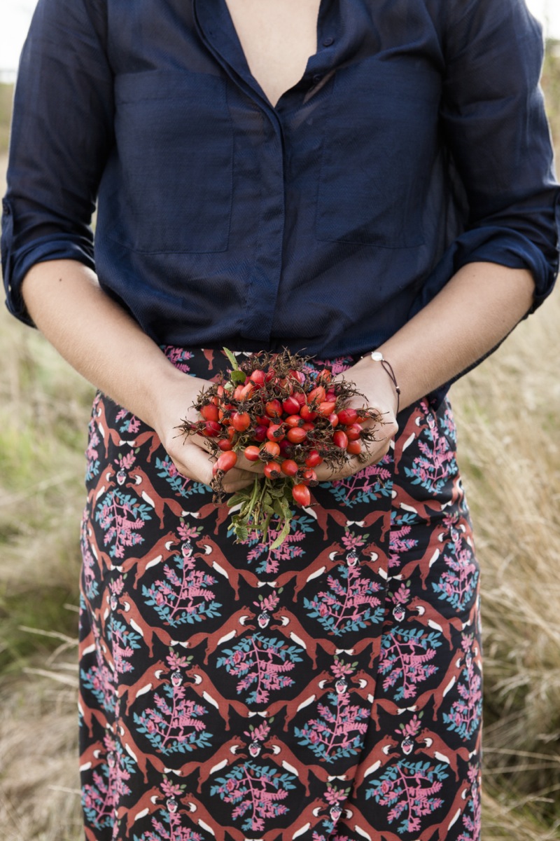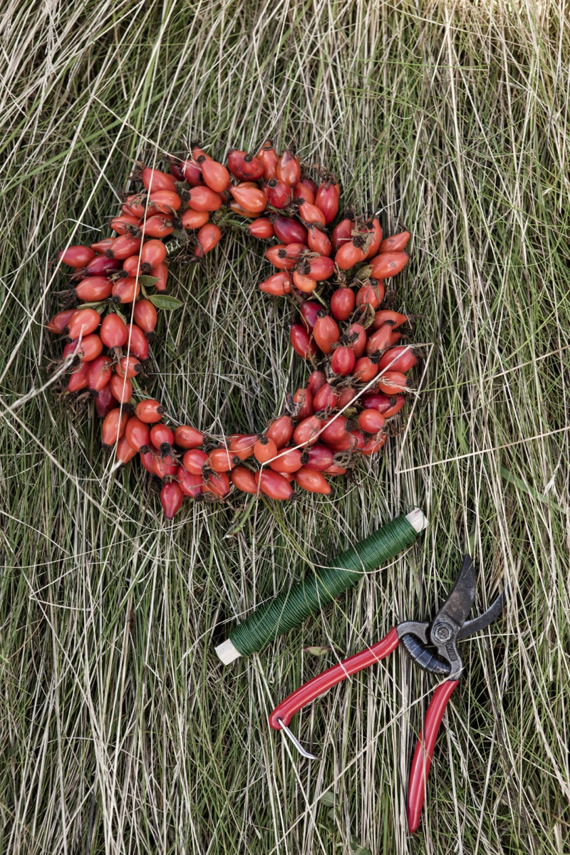 Jetzt im Herbst tragen die Wildrosen die schönsten Hagebutten! Ich freue mich jedes Mal, wenn ich große Rosenbüsche mit ihren rot leuchtenden Früchten beim Spazierengehen entdecke. Um diese Zeit habe ich immer eine kleine Rebschere in meiner Tasche. Es ist wunderschön damit im Haus zu dekorieren! Allein ein Zweig Hagebutten in einem Glas sieht wundervoll aus! Für meinen Kranz binde ich ein Bündel aus Hagebutten mit Draht zu einem Kranz. Diese Bilder sind übrigens während des Shootings für mein Kochbuch "Theresas Küche – Kochen mit Freunden" im letzten Herbst entstanden. Ich mag sie sehr und möchte sie heute mit euch teilen. Wie dekoriert ihr am liebsten in dieser Jahreszeit?