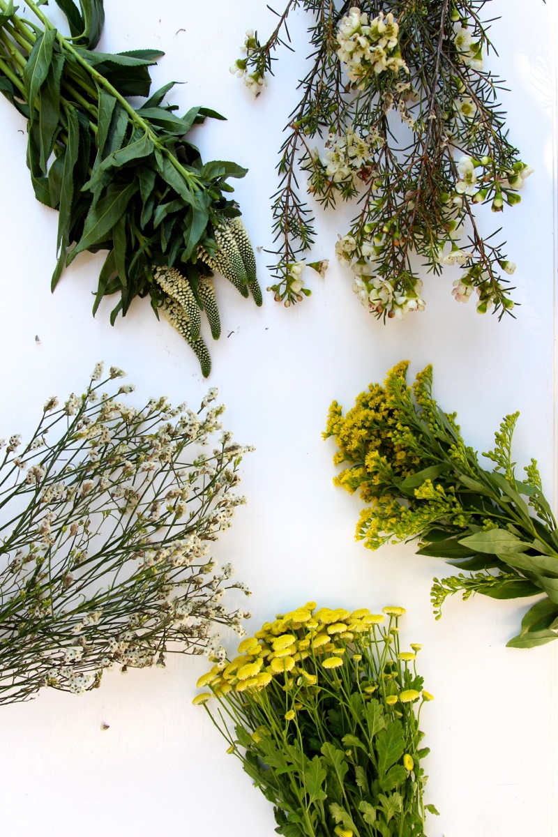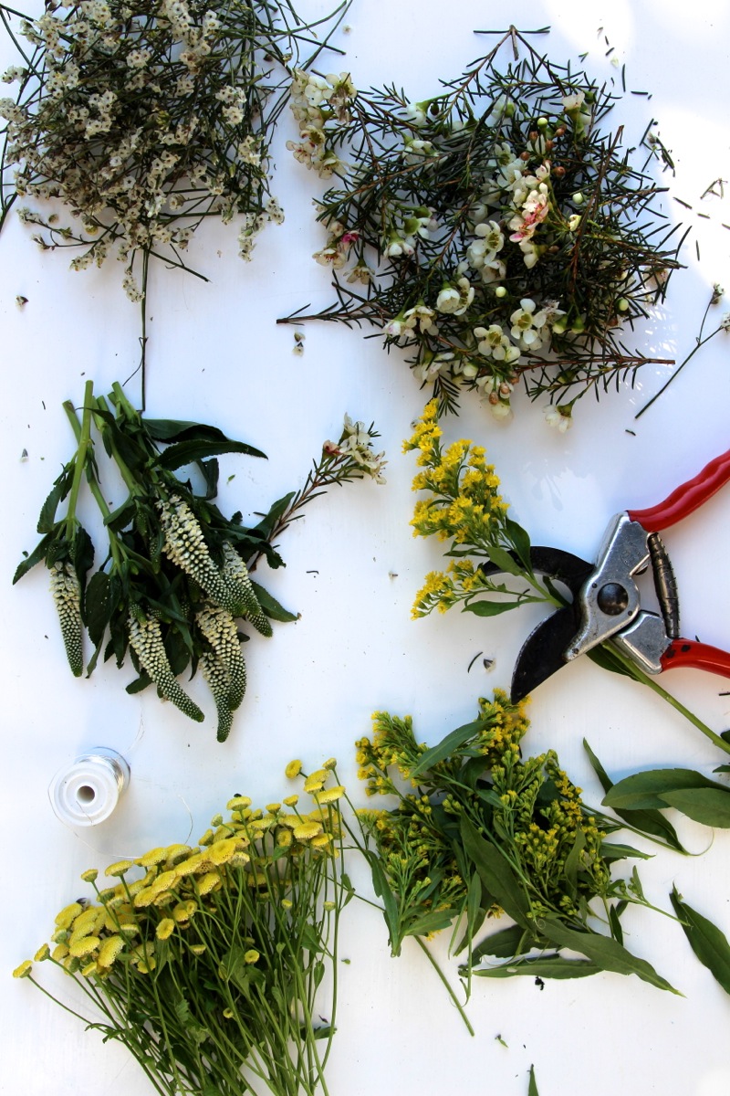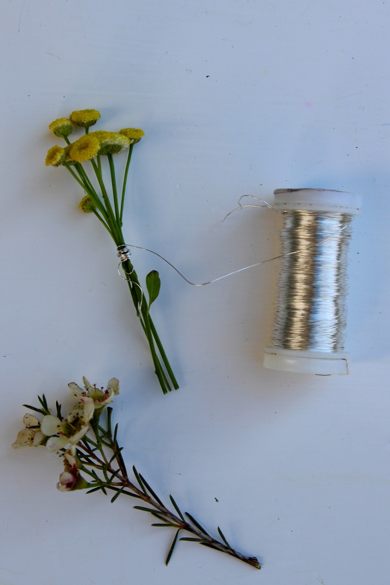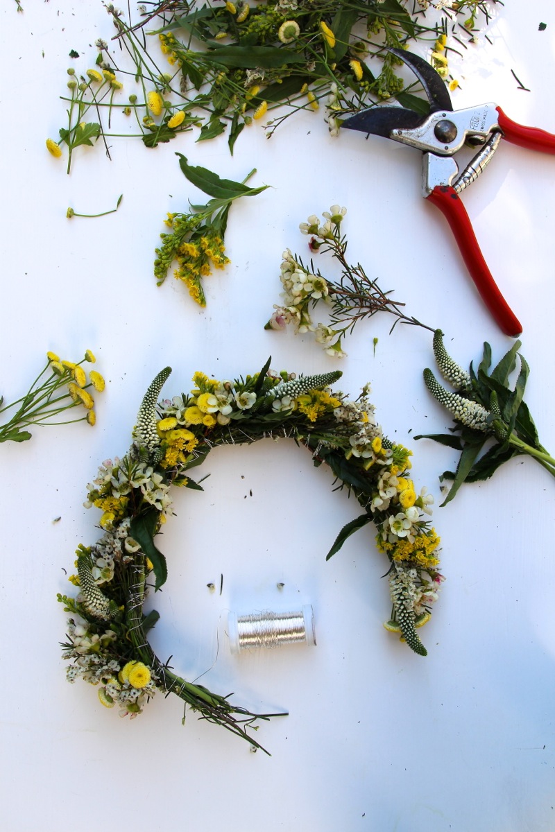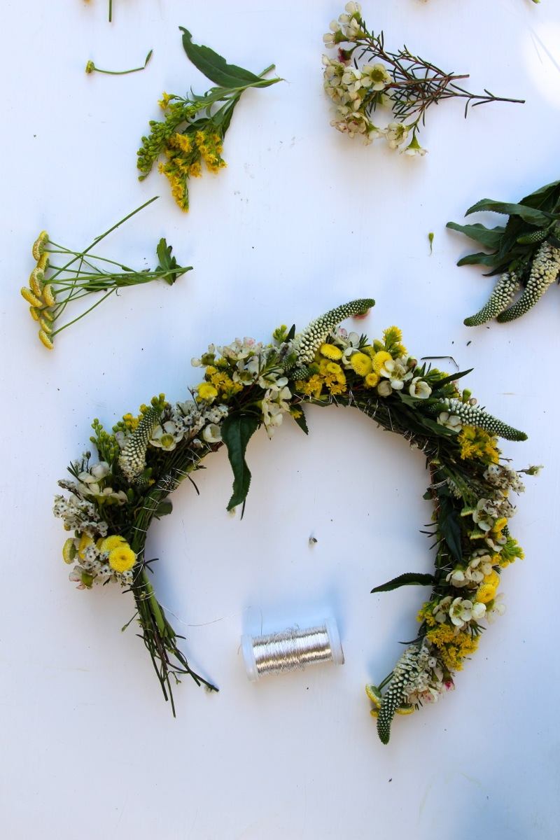 Für den Kranz verwende ich Blüten, die ich farblich zu meinem Outfit abstimme. Hier sind es zartgelbe Goldrute und Mutterkraut und die weißen Blüten von Wachsblume, Statice und Schnee-Felberich. Außerdem brauche ich eine Schere, feinen Silberdraht und ein Stoffband.
