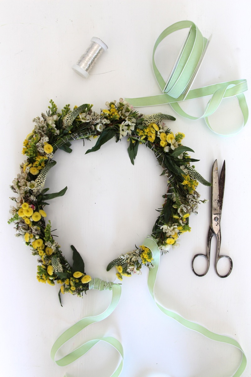 Die Blumen in 5 cm lange Stiele zurechtschneiden. Die erste Blüte mit Silberdraht umwickeln. Danach die unterschiedlichen Sorten dazubinden, bis der Kranz die gewünschte Länge erreicht hat. Zum Schluss an die Enden Stoffbänder zum Verschließen befestigen.