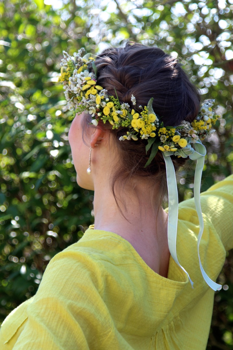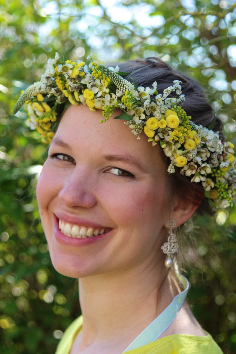 Die Tradition der Sommer-Sonnenwende rund um den 21. Juni kommt ursprünglich aus Schweden. Dort wird Midsommar mit der ganzen Familie und mit Freunden sehr fröhlich gefeiert. Die Mädchen tragen Kränze aus Wiesenblumen. Es wird um einen mit bunten Bändern geschmückten Baum getanzt, Lieder gesungen und an einer sommerlichen Tafel gegessen. Solch ein Blütenkranz mit flatternden Bändern ist im Handumdrehen gebunden und bei Festen ein wunderschönes Schmuckstück für das Haar.