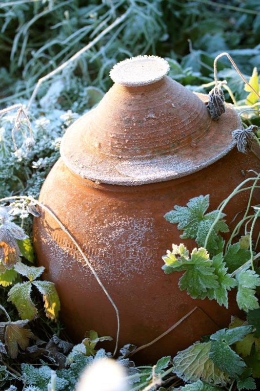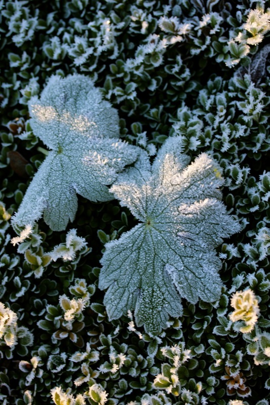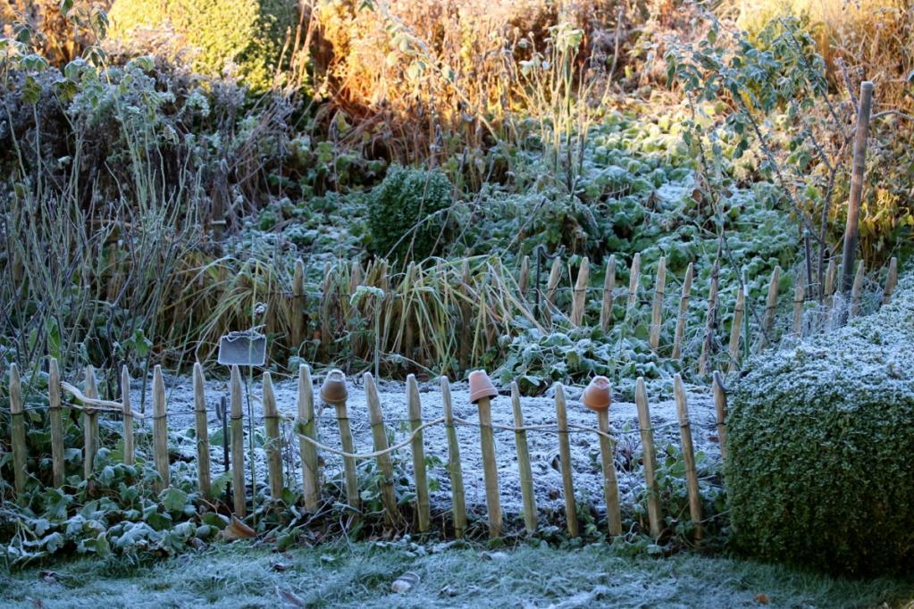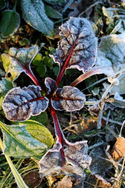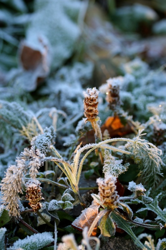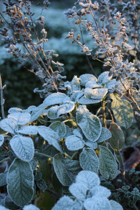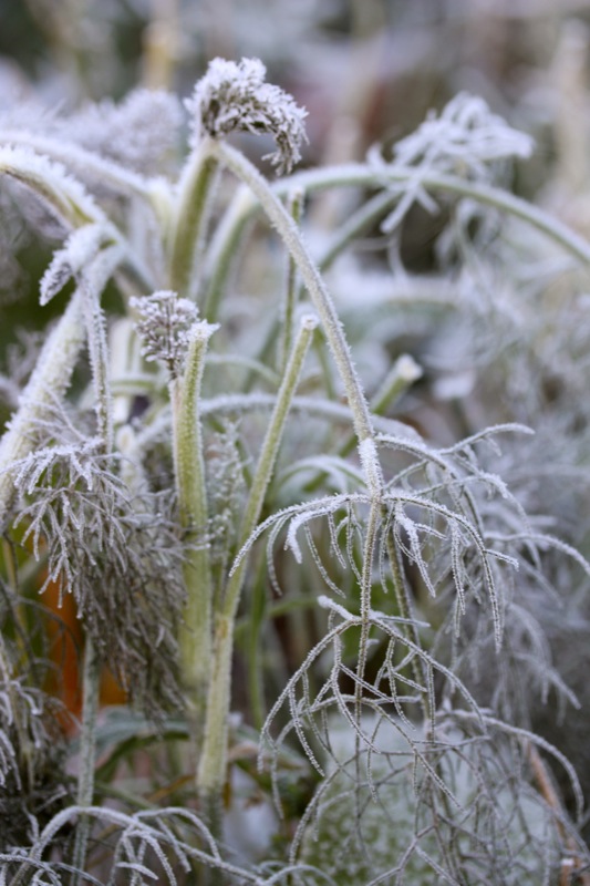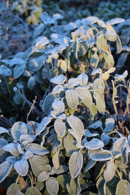 Oh, welche eine Freude! Schon als Kind stürmte ich sofort hinaus, wenn Väterchen Frost den Garten über Nacht winterlich verzaubert hatte. Dill, Salbei, Thymian, Majoran und Mangold, sie alle lagen gestern Morgen unter einer feinen Eisschicht. Schnell die warmen Stiefel anziehen, eine Wolljacke überstreifen und hinaus in den Küchengarten! Der Atem kondensiert in der Luft.