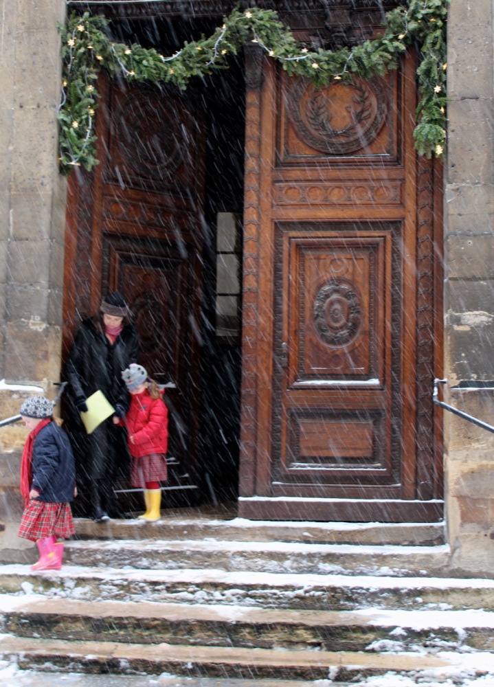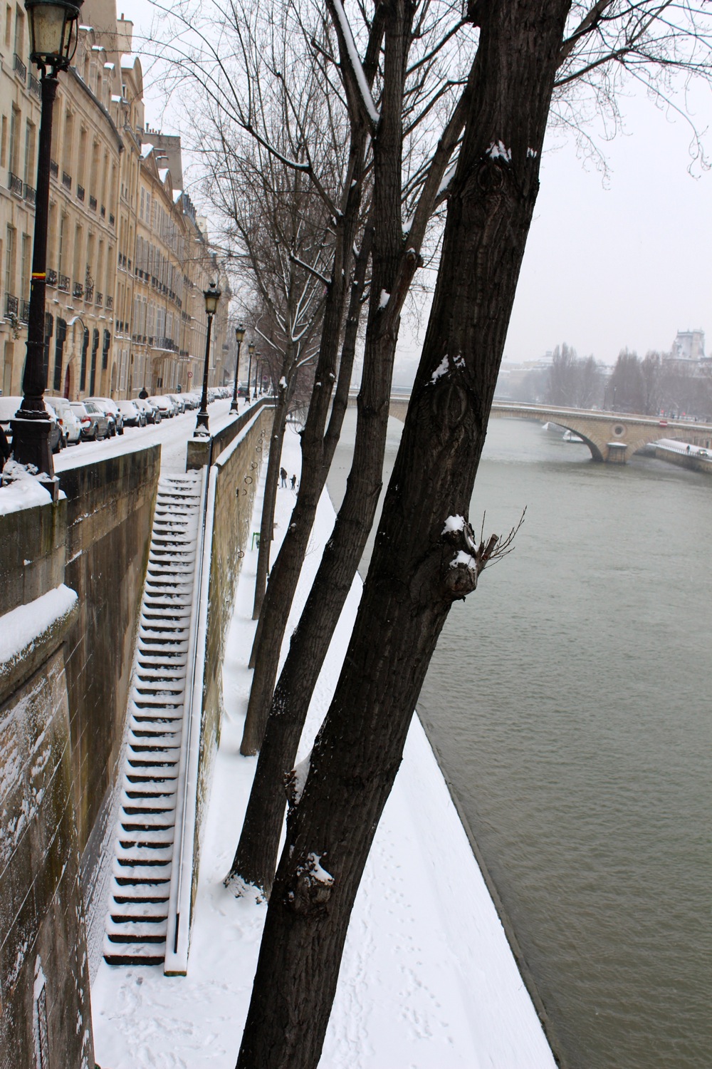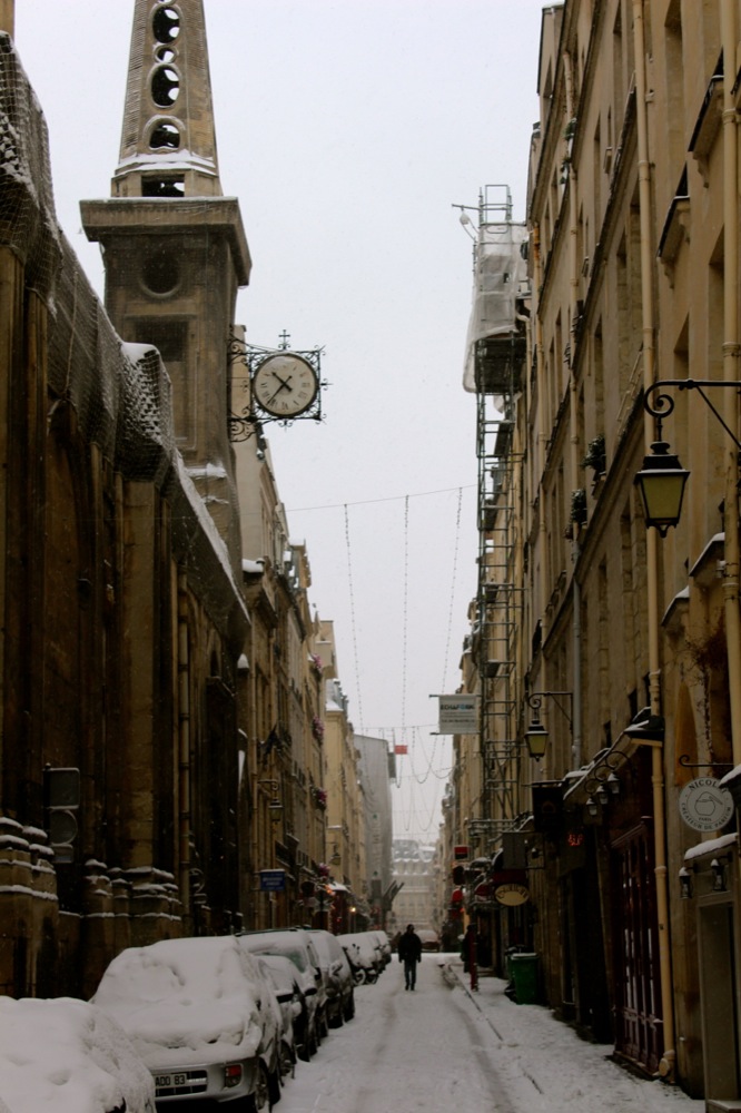 An diesem Sonntag im Januar bedeckt eine wunderbare Schneedecke die Häuser dieser Stadt. Warm angezogen mache ich mich in den Morgenstunden auf den Weg für einen langen Winterspaziergang an der Seine entlang. Auf der Ile Saint Louis läuten die Glocken für den Gottesdienst. Großmütter, verliebte Paare, Familien, Kinder in Schottenröcken und bunten Gummistiefeln stapfen eilig durch die verschneiten Gassen. Schnell die kleine Stiege hinauf ins Warme. Drinnen heimlich die nassen Stiefel auf dem warmen Gebläse aus dem Kirchenboden aufwärmen und dabei dem Halleluja lauschen...