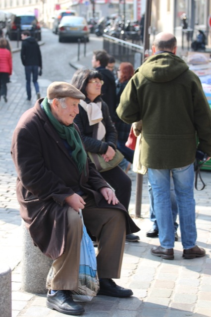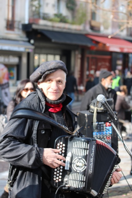 Vom Place Saint-Médard ertönt bereits das Akkordeon von Christian Bassoul. Auf dem Platz tanzen die Leute im französischen Musette-Rhythmus zum Chanson Moulin Rouge von Georges Auric. Die Texte werden gratis zum Mitsingen verteilt. Der Akkordeonspieler ist die Seele der Rue Mouffetard und lässt uns jeden Sonntagnachmittag eintauchen in die Welt von Edith Piaf, Charles Trenet oder Francis Lemarque. Winters wie sommers vermögen seine Melodien die Vorbeiflanierenden mitten ins romantische Herz zu treffen. Es ist eine Aufforderung zum Tanz! Egal, ob junger Student oder schon etwas älterer Herr, entschlossen wird das Jackett zurechtgerückt, der Arm um die charmante Begleitung gelegt und zwei, drei Runden dem französischen Himmel entgegen gedreht. Oh ja, Paris, Paris!