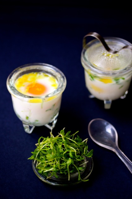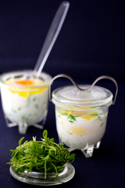 Das Glas mit Butter einfetten und dann mit etwas Kresse, Zitronenschale und Fleur de Sel befüllen. Zum Schluss ein Ei hineinschlagen. Ich habe auf das Ei noch einen Spritzer Zitronen-Olivenöl gegossen. Dies gibt dem Ei zusätzlich noch ein feine, zitronige Note.