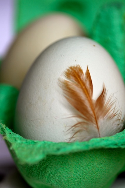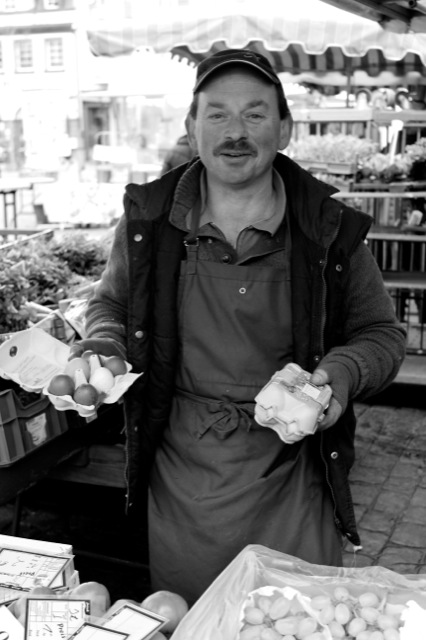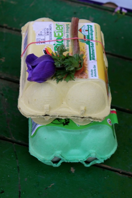 Mein treuer Markthändler Werner Schollmeier aus Heddesheim (man beachte seine blumige Geste auf den Eierschachteln!) hat eine Hühnerschar, die für ihre Eier-Farbpalette einen Preis gewinnen könnte: Von Cremeweiß über Himmelblau bis Salbeigrün. Und dann gibt es da noch die Gespreckelten und die Zwiebelroten! Es ist bei jedem Einkauf ein kleines Osterfest!