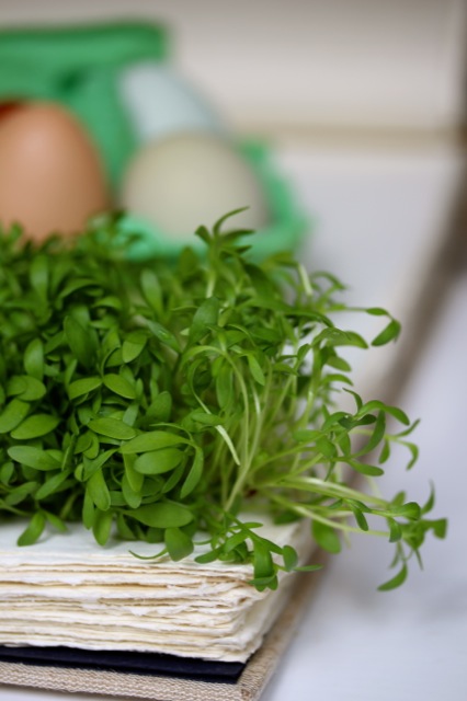 In der kurpfälzischen Provinz hat die Kressesalat-Saison begonnen! In großen geflochtenen Körben türmen sich auf dem Wochenmarkt nun wieder in hohen Bergen die zarten Halme der Kresse. "100 g für 1 Euro" ist mit Kreide auf den schwarzen Schiefertafeln geschrieben. Ich muss beim Anblick des Salates nicht lange überlegen, was es zu einem späten Frühstück in meiner Küche geben wird. Die Frühlingsgelüste in meinem Bauch wünschen sich eine Kressevariation, wie sie purer im Geschmack nicht sein könnte: Ein Ei im Glas mit Kresse und Zitronenschale, begleitet von einem scharfen Kressesalat, mariniert mit einer süßen Salatsauce aus Olivenöl, Agavensirup und einem Hauch Zitrone. Dazu gibt es eine Scheibe frisch gebackenes Krustenbrot, bestrichen mit salziger Butter aus Frankreich und obendrauf natürlich ganz viel Kresse!