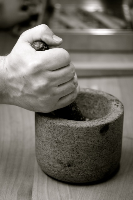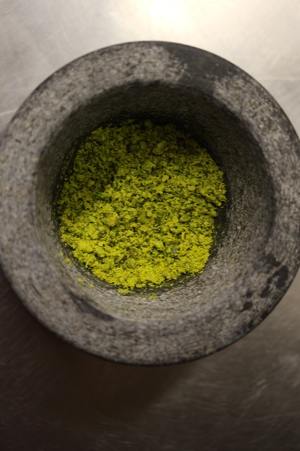 - Die Pistazien in einem Mörser mittelfein mahlen.