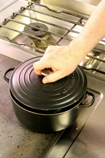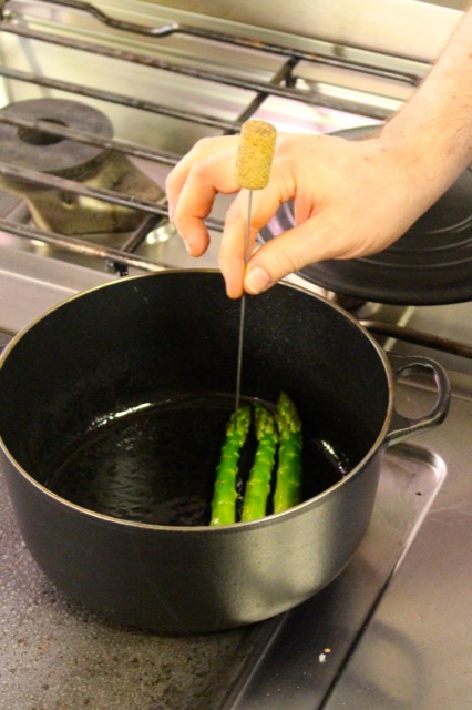 Den gusseisernen Topf auf den Herd stellen. Wenn der Topf heiß ist, das Olivenöl hineingeben und die Spargel hineinlegen. Mit geschlossenem Deckel ein paar Minuten braten lassen. Mit einer Nadel prüfen, ob sie gar sind.