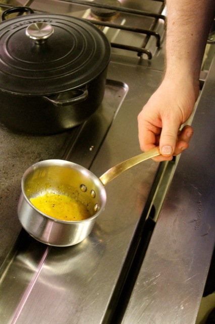 Die Orangenfilets erwärmen, aus den Spargelenden ein Püree kochen.