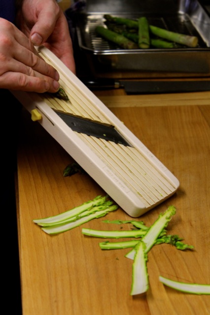 Die Spargelenden abschneiden. Die Spargelspitzen hauchfein hobeln.