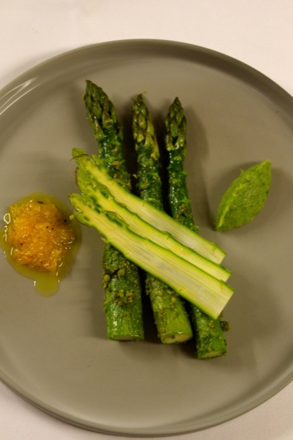 - 12 Spargelstangen in Olivenöl dünsten und zum Schluss die Pistazien dazugeben und die Spargelstangen damit ummanteln.