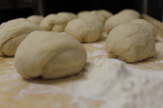 Den Teig auf einer leicht bemehlten Fläche zu einer 8 cm dicken Rolle formen und in gleichmäßige Stücke schneiden. Die Teiglinge in der Hand zu runden Kugeln formen und auf dem Backbrett abgedeckt nochmals 20 Minuten gehen lassen.