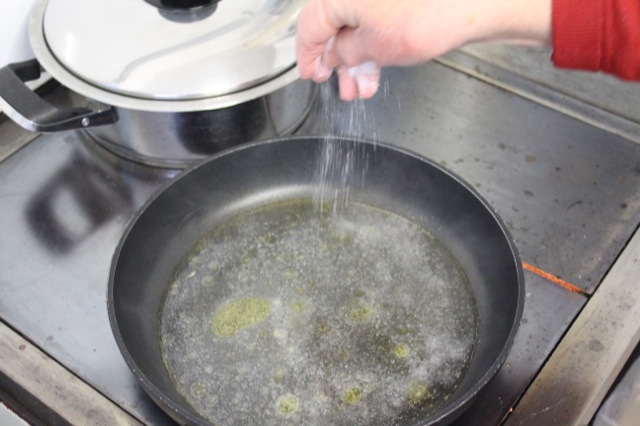 In einer Teflonpfanne auf mittlerer Hitze das Fett zergehen lassen. Sobald das Butterschmalz geschmolzen ist, Wasser und Salz dazugeben und aufkochen lassen.