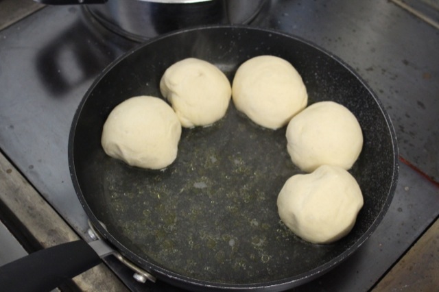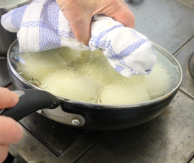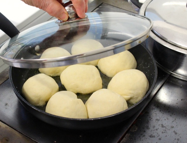 Anschließend die Dampfnudeln in die Pfanne setzen und bei schwacher Hitze unter dem geschlossenem Deckel etwa 25 Minuten backen, bis die Dampfnudeln ein goldbraunes Krüstchen bekommen haben.