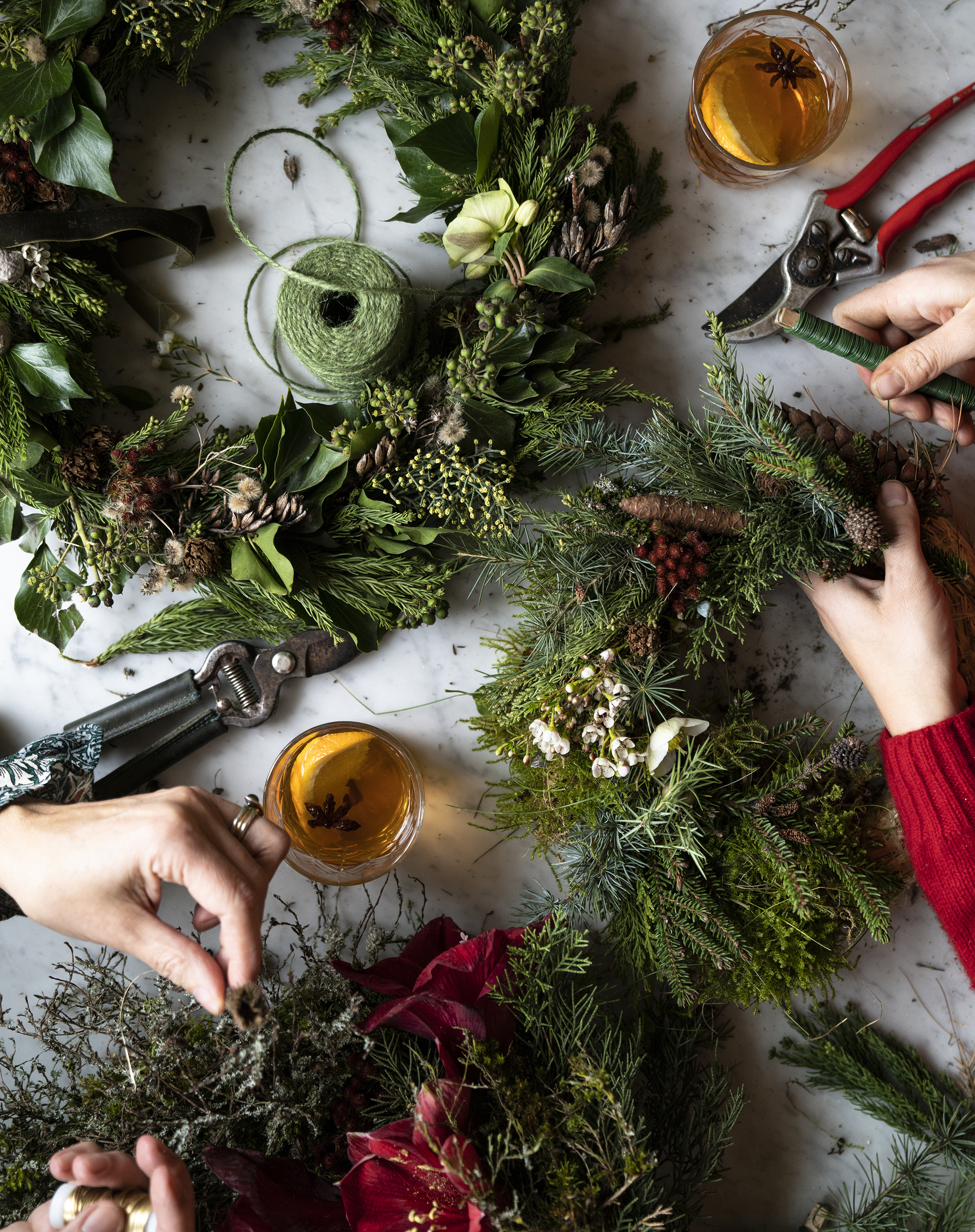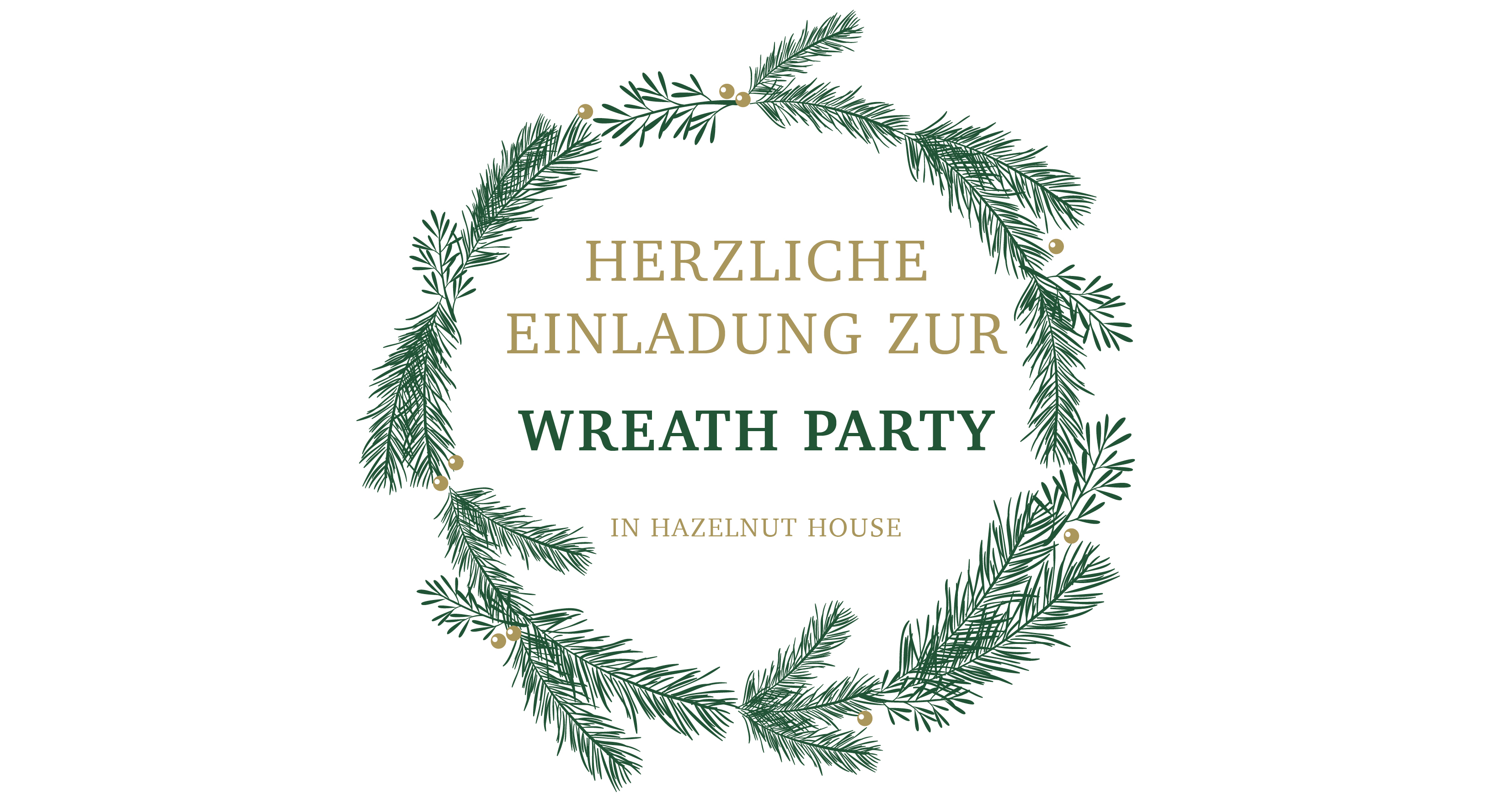 In Hazelnut House ist der Herbst eingekehrt. Die Luft am Morgen ist feucht und die Blätter am Birnbaum färben sich bereits in den schönsten Farben. Wie sehr freue ich mich auf die kommende gemütliche Zeit! Vor ein paar Tagen ist mein neues Buch "Weihnachten – Rezepte für die schönste Zeit des Jahres" erschienen. Die Vorfreude auf den Advent könnte für mich größer nicht sein! Denn Weihnachten in Hazelnut House ist einfach magisch! Dies möchte ich sehr gerne mit Euch teilen und lade Euch ganz herzlich ein zur Wreath Party am 20. November in Hazelnut House!Der Tisch im großen Kaminsaal ist bereits eingedeckt. Aber nicht mit Geschirr, sondern auf braunem Packpapier liegen akkurat die handwerklichen Utensilien bereit: Rote Gartenscheren, Bindedraht in unterschiedlichen Stärken und Strohringe als Unterlage. Der ganze Raum duftet nach den vielen Bündeln von Tannengrün, nach einem Hauch von Eukalyptus, mediterranen Kräutern und nach dem Harz der Pinienzapfen. Aus dem Wald von Hazelnut House habe ich flechtenüberzogene, knorrige Zweige für Euch mitgebracht. Und Misteln von unserer alten Streuobstwiese. Welch ein Potpourri aus weihnachtlichen Wohlgerüchen! Und welch eine Freude mit all diesen Schätzen aus der Natur zu arbeiten! Von draußen perlt das Lachen der Ankommenden herein. Willkommen, höre ich mich entgegenrufen. Ein Lieblingswort. Im Sandsteinkamin knistert das Feuer und wir genießen warme Scones mit dampfendem Tee. Danach gehen wir gemeinsam ans Werk. Durch die Kombination aus unterschiedlichem Grün, Blüten, Zapfen und sogar Federn entstehen unter unseren Händen die wundervollsten, weihnachtlichen Kränze. Ob ein eindrucksvoller Türkranz oder ein Adventskranz zum Aufhängen oder Aufstellen, alles ist möglich. Jeder Kranz wird zu einem wundervollen Unikat!
