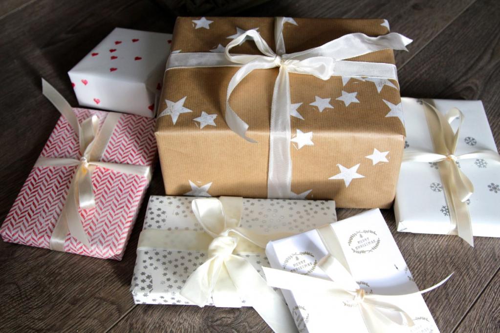 Das Packpapier mit der raueren Seite nach oben auslegen, nach belieben bestempeln und trocknen lassen. Fertig ist Eure persönliche Geschenkverpackung!
