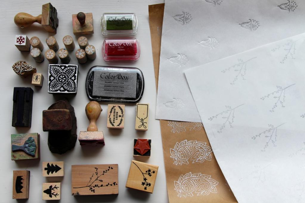 - ggf. Moosgummi (Wenn ihr mit alten Holzstempel arbeitet, erzielt ihr schönere Abdrücke mit einem leicht nachgebenden Untergrund unter dem Papier)
