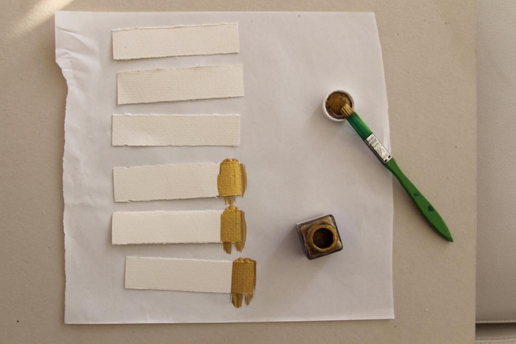 Festes Aquarellpapier ist eine wunderbare Basis für Menü- und Tischkarten! Ich habe es mit einem Messer zurechtgeschnitten. So sind die Seiten rauer. Das Ende der einzelnen Stücke habe ich mit goldener Farbe pepinselt. Nun fehlt nur noch ein Goldstift für die Beschriftung! Die kleinen Löffel mit Loch gibt es übrigens günstig bei Butlers (Puro Espressolöffel). Sie dienen als zauberhafte Tischkarten! Dafür habe ich einfach das Namensschild mit einem Samtband durch das Loch gefädelt.
