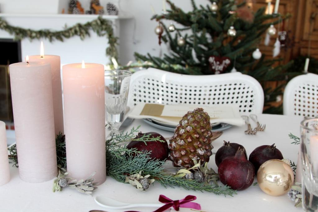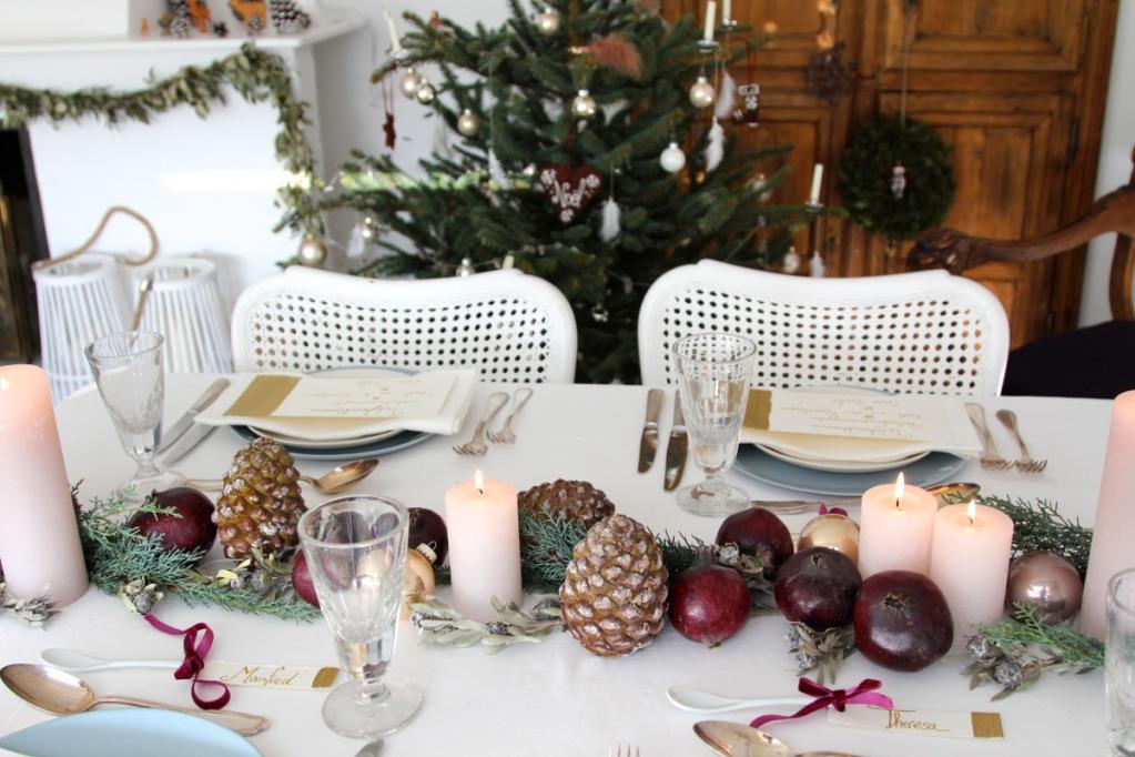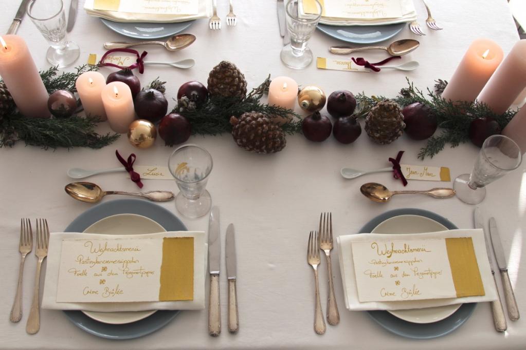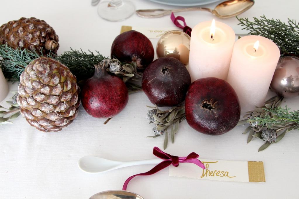 In die Mitte des Tisches habe ich dunkle Granatäpfel, Pinienzapfen und verschiedenes, winterlich anmutendes Pflanzengrün verteilt. Dazu ein paar Glaskugeln und durchgefärbte Kerzen. Voilà, die Gäste können kommen!