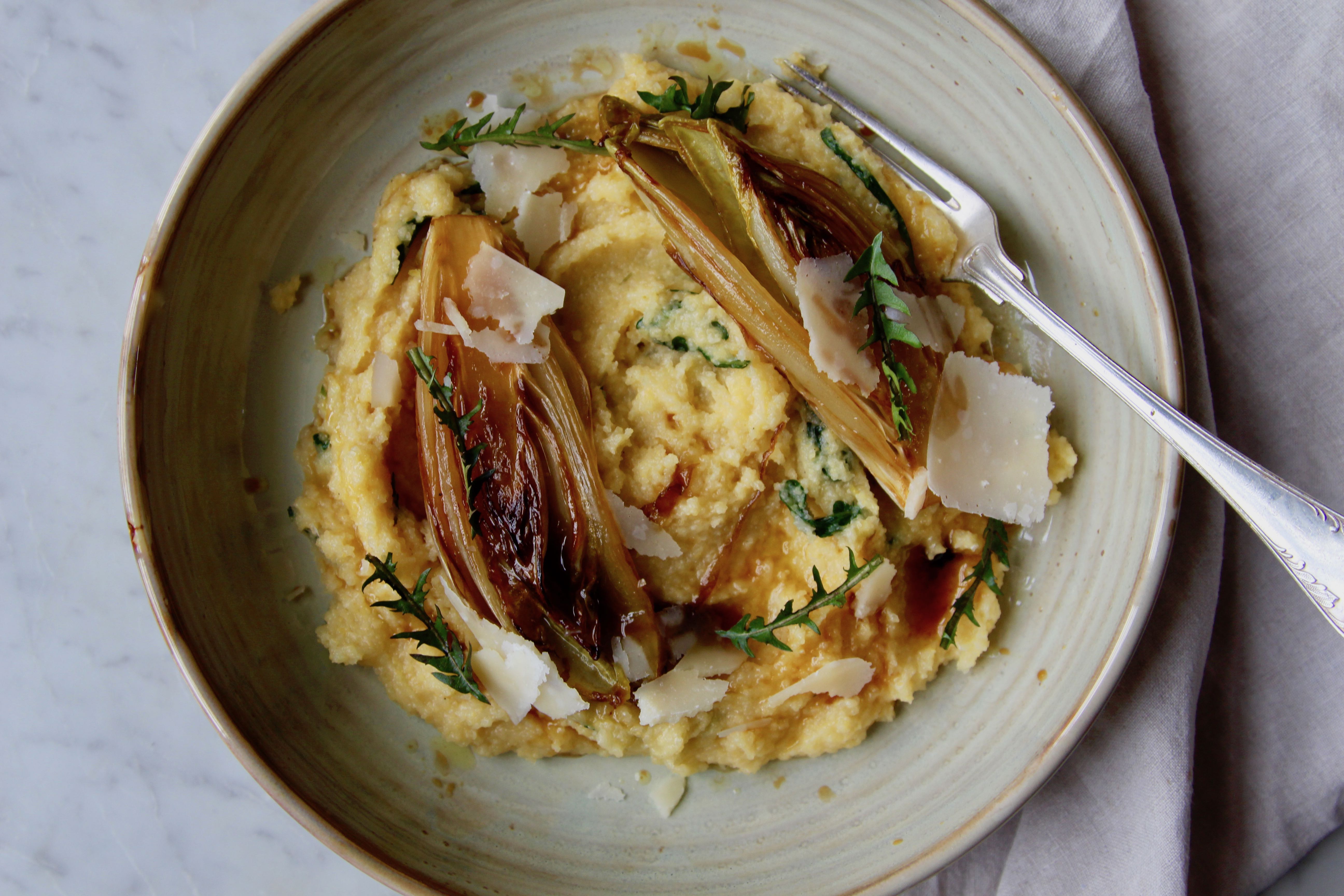 Quitte trifft Chicorée und Löwenzahn: Löwenzahn-Zitronen-Polenta mit