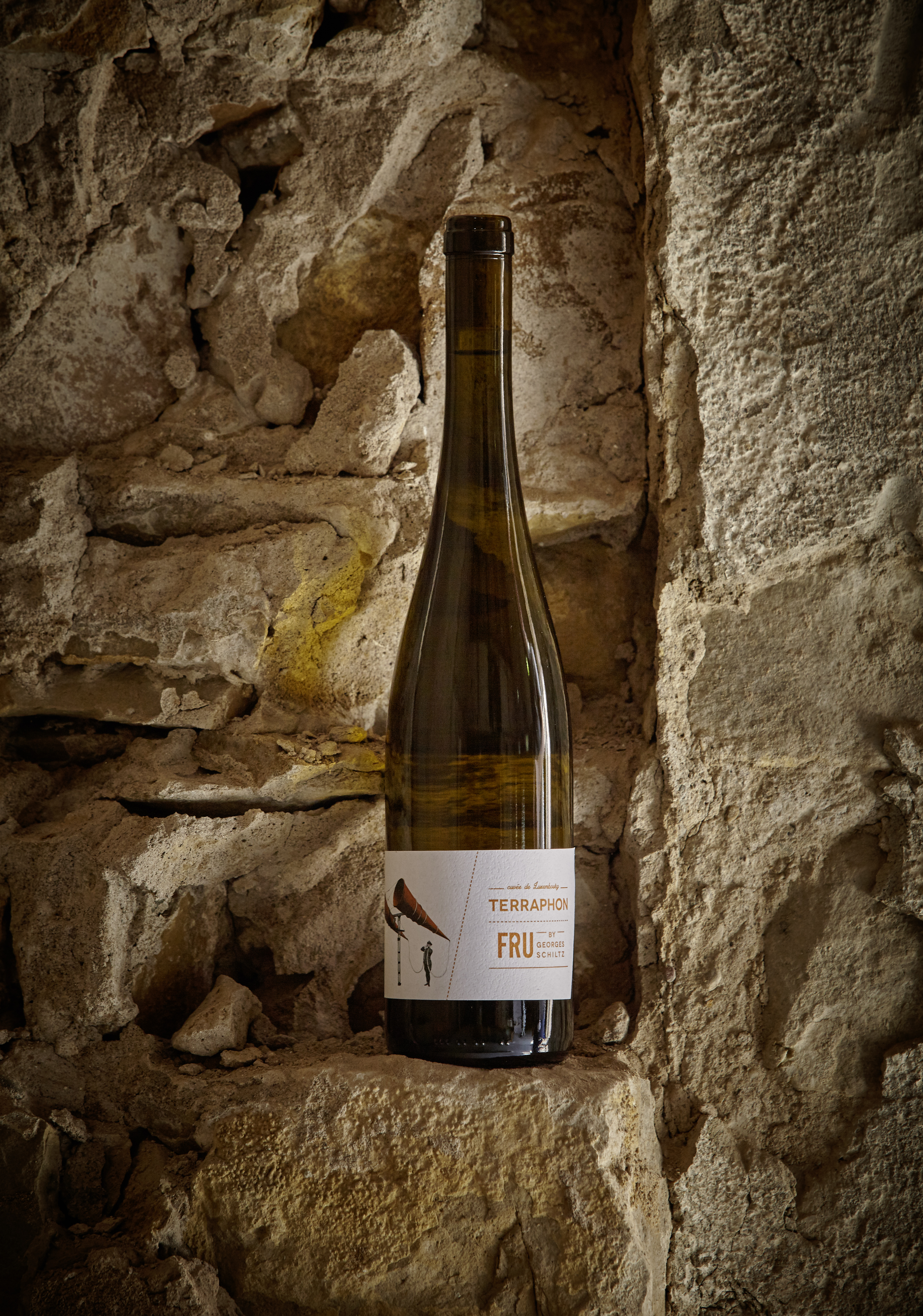 Die Freude, die Georges Schiltz bei der Arbeit und an seinen Produkten hat, zeigt sich nicht nur geschmacklich in den hochwertigen Getränken, sondern auch in der optischen Gestaltung der Etiketten. Seine Kreativität bei der Betitelung der Weine und die Liebe zum Detail sind sofort zu spüren. Georges lacht und erzählt schmunzelnd von seiner Überzeugung: „Der Wein ermöglicht uns der “Musik des Bodens” zu lauschen“. Folglich ziert das Etikett der Cuvée TERRAPHON die Abbildung eines historischen Gerätes zum Abhören des Weltalls. Der Hauptdarsteller dieses Weines ist die Rebsorte Auxerrois. Diese weniger bekannte Rebsorte gedeiht im Luxembourgischen Moselklima prächtig und lädt zum Probieren ein. Wer selbst Freude an der Ernte oder beim Auflesen von Streuobstfrüchten hat, darf sein Obst bei der Manufaktur FRU gerne entsaften lassen. Die abgefüllte Köstlichkeit trägt danach gewiss die Begeisterung mit in die eigenen vier Wände!