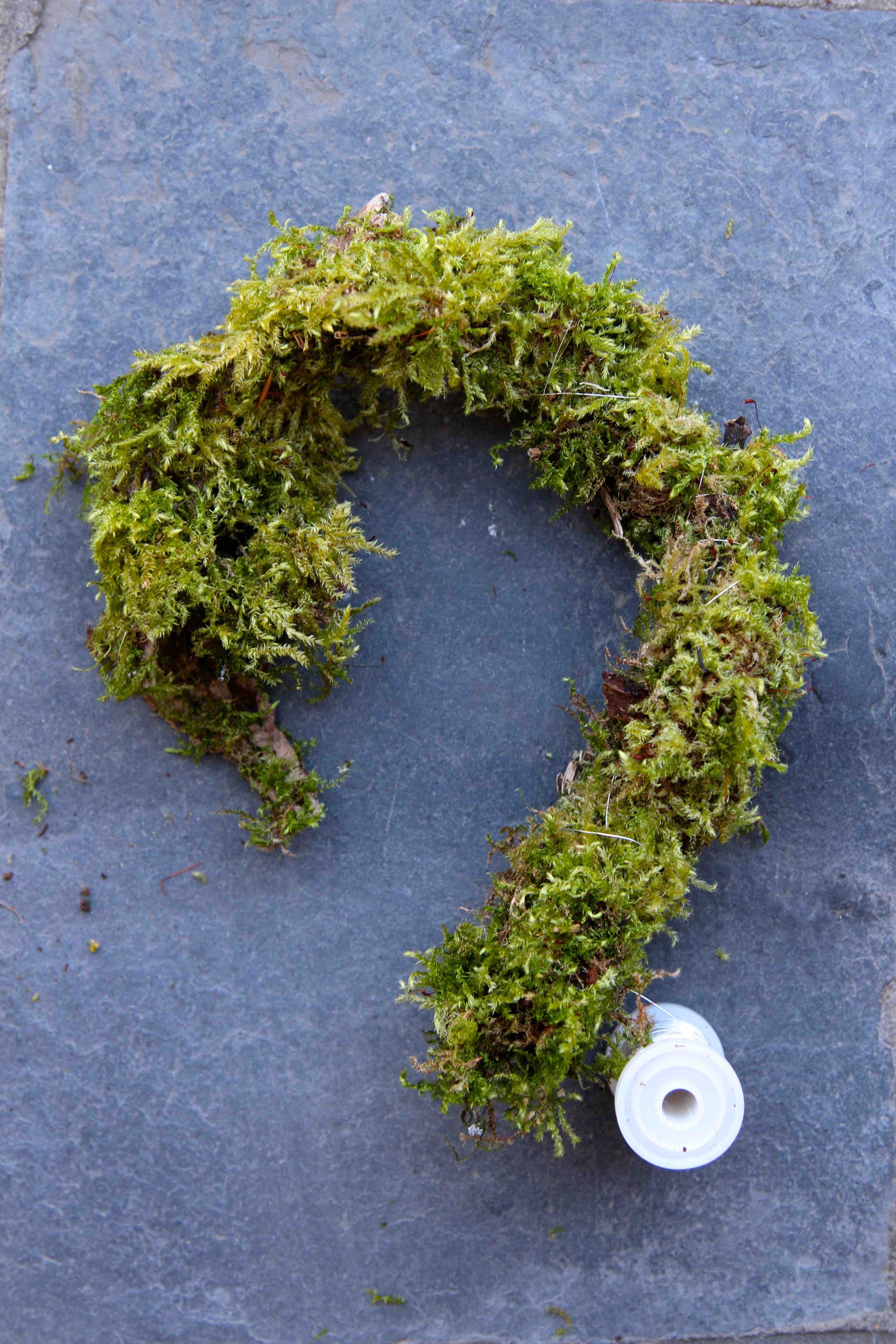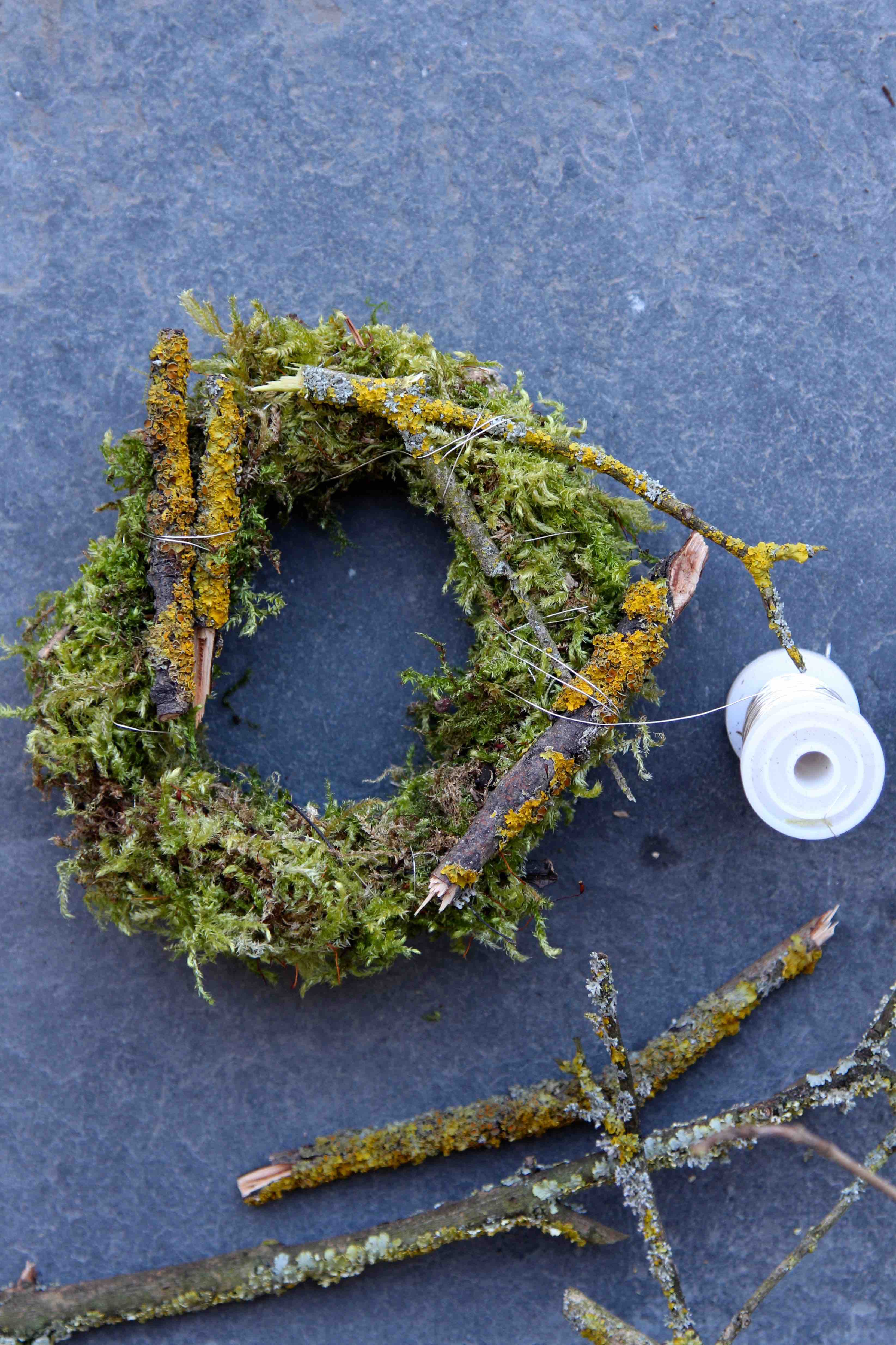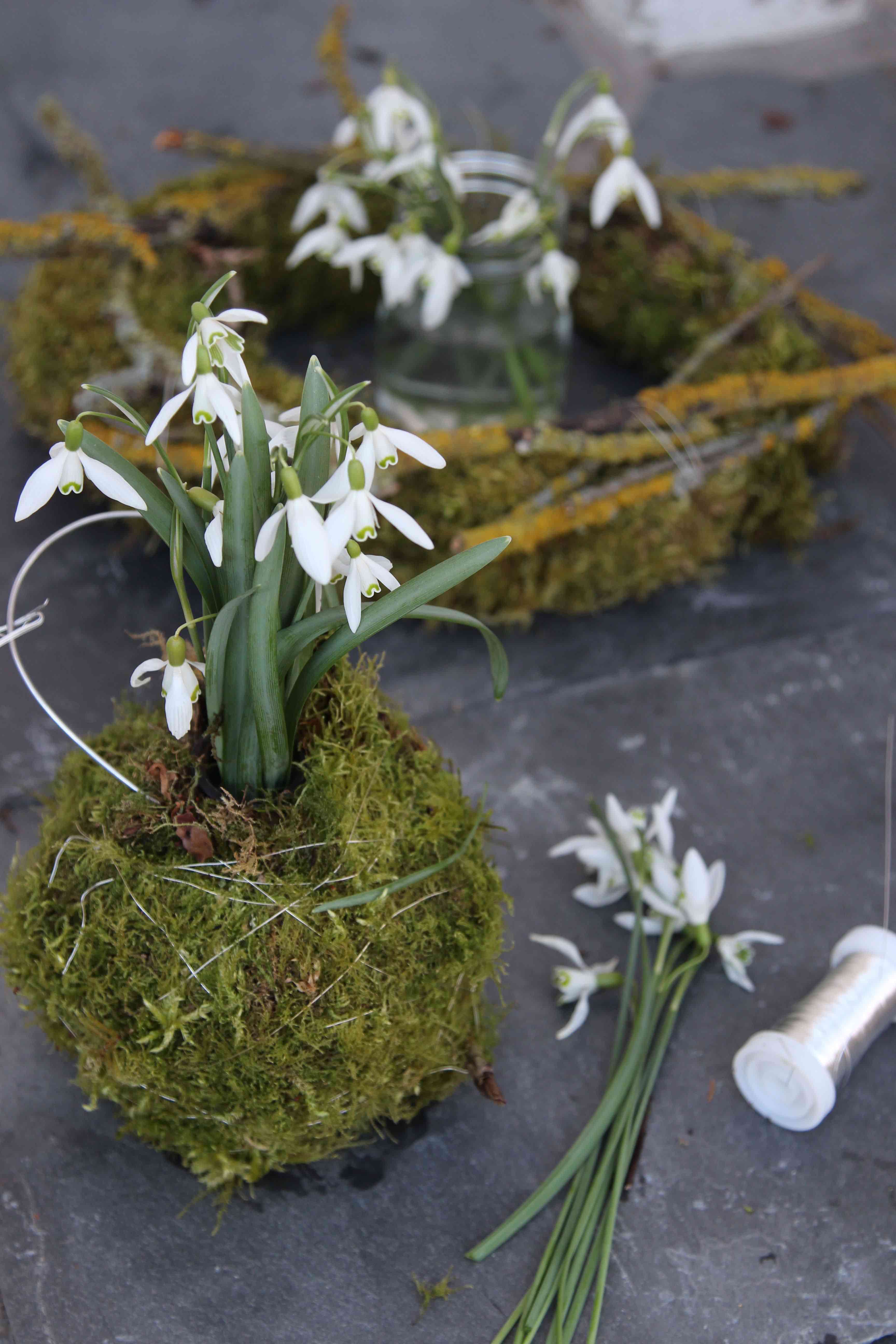 Das Moos binde ich mit einem feinen Silberdraht erst zu einer Schlange und forme diese zu einem Kranz. Darauf befestige ich schließlich mit Draht kleine Äste. In die Mitte stelle ich ein kleines Joghurtglas und befülle es mit den Schneeglöckchen.