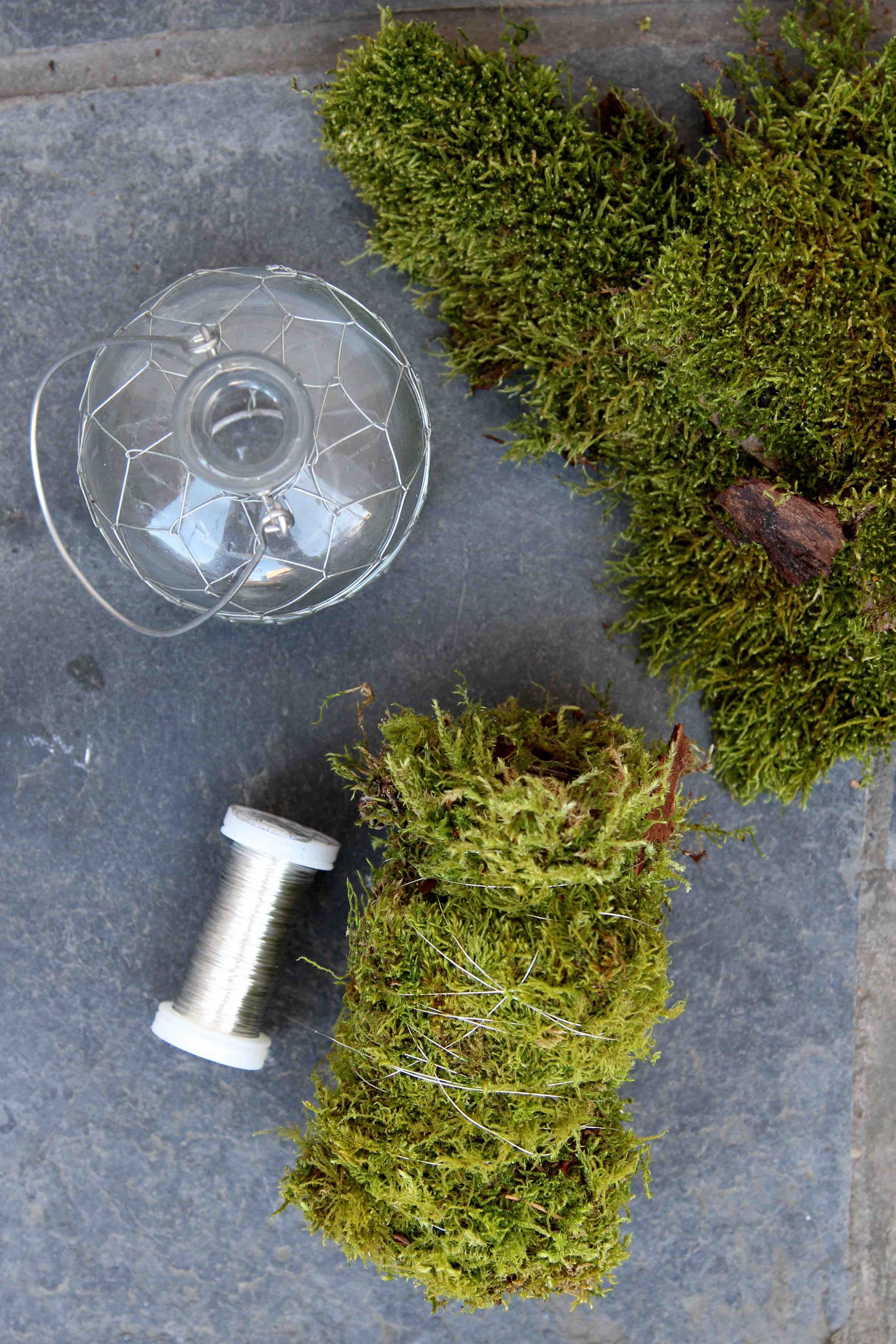 Auch Glasvasen lassen sich leicht zum Aufhängen mit einem Drahthenkel versehen. Mit Moos umwickelt werden sie zu einer zauberhaften Vase für meine Blüten aus dem Garten.