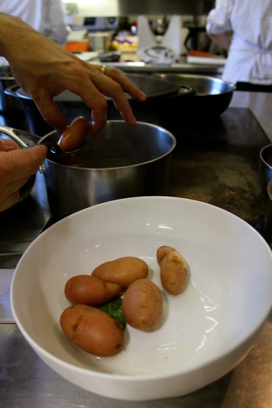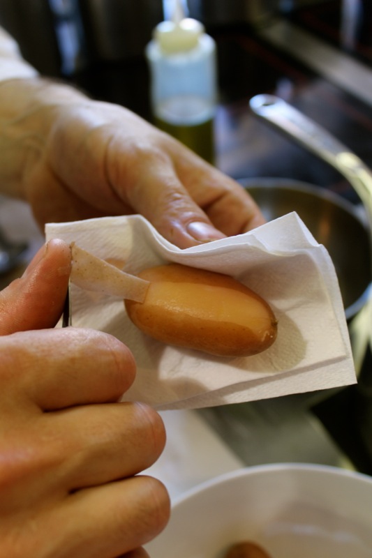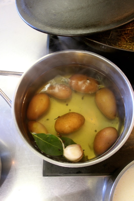 Die gewaschenen Kartoffeln in einen Topf mit leicht gesalzenem Wasser geben. In das Kartoffelwasser kommen außerdem ein Lorbeerblatt, ein kleiner Thymianzweig, eine ungeschälte Knoblauchzehe und ein paar Pfefferkörner. Die Kartoffeln auf kleiner Flamme ungefähr 10 Minuten köcheln lassen, je nach Größe. Die Kartoffeln mit einer Gabel herausnehmen und pellen. Das Kartoffelwasser behalten.
