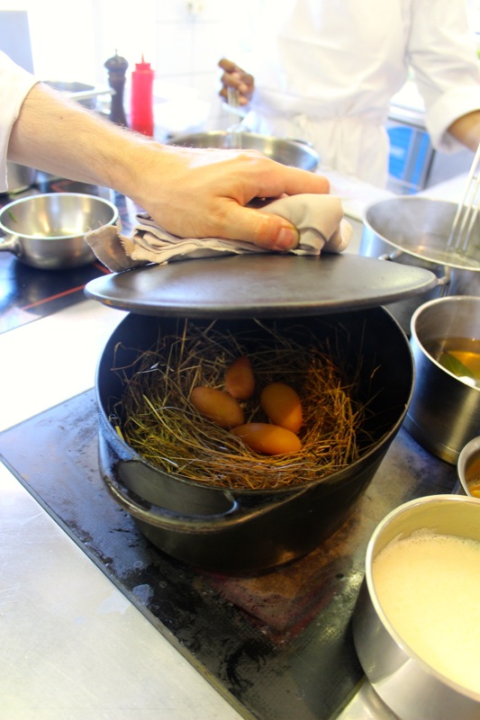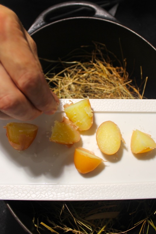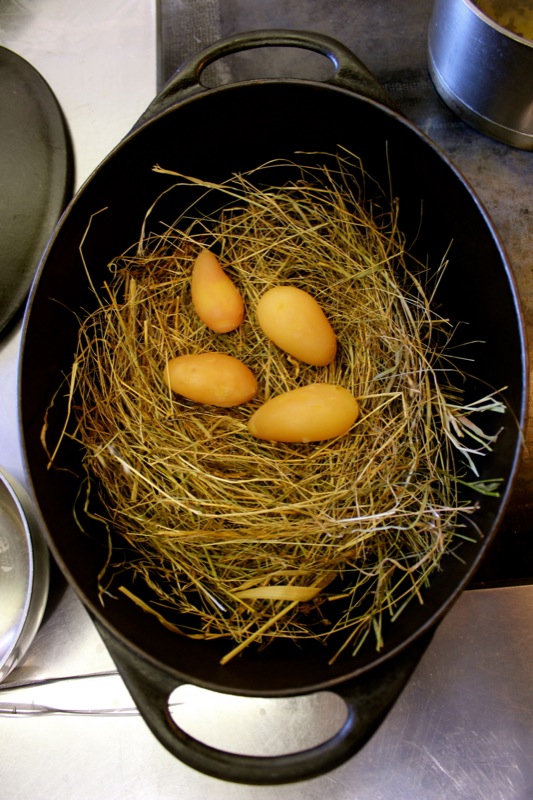 Eine gusseiserne Kasserole auf den heißen Herd stellen und 300 g biologisches, sauberes Heu zu einem Nest formen und hineinlegen. Die geschälten Pellkartoffeln wie Eier in das Heunest legen und unter geschlossenem Deckel räuchern. Die Kartoffeln jetzt einfach pur mit Fleur de Sel genießen!