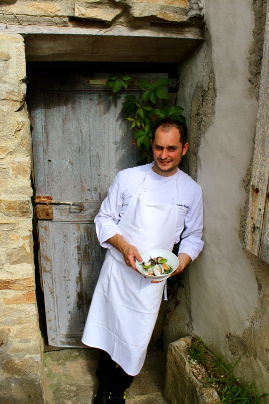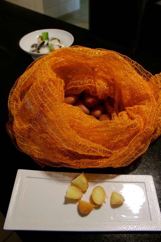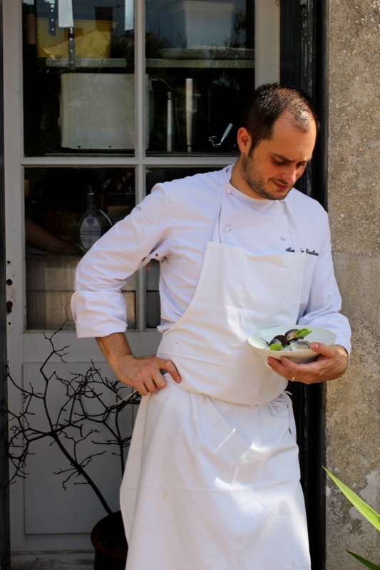 Céline Couillon ist die Frau des Küchenheldens und begrüßt mich herzlich am Eingang. Warten Sie, ich hole den Chef! Der Koch wird in Frankreich immer mit Chef angesprochen, sogar von der eigenen Frau :) Dann steht er vor mir, Alexandre Couillon! Begeistert erzähle ich ihm von meiner Ernte auf dem Feld von Jean-Pierre Tessier und überreiche ihm die Kartoffeln. Es haftet noch etwas Sand an den Ecken... „Mit der habe ich noch nie gearbeitet!“, erzählt er mir und lacht. „Nun ja“, argumentiere ich, „es ist vielleicht keine Sterne-Kartoffel, aber es ist eine alte, französische, sehr besondere Kartoffelsorte. Für meine Leser würde ich gerne eine leichte, unkomplizierte Zubereitung (von einem Sternekoch!! Ist so etwas überhaupt möglich?) vorstellen, die den Geschmack der Roseval in den Vordergrund stellt.“ Ich spüre, dass er sich eigentlich ein Rezept mit einer anderen Kartoffel überlegt hatte und nicht viel Zeit hat. Alexandre grübelt, dann sagt er: „Wissen Sie was? Ich lasse mir etwas einfallen!“ Erleichterung kommt in mir auf, ich darf auf dem roten Designersofa in der Eingangshalle Platz nehmen und bekomme einen Cappuccino in schönster Weise serviert.