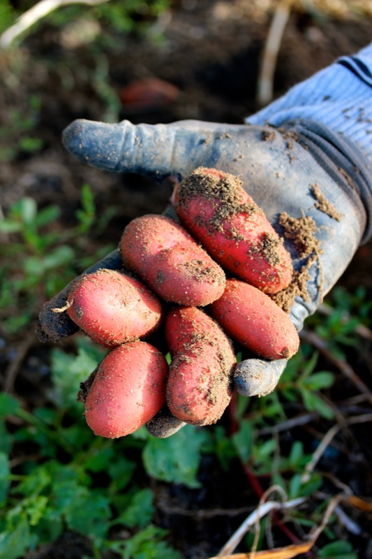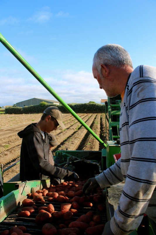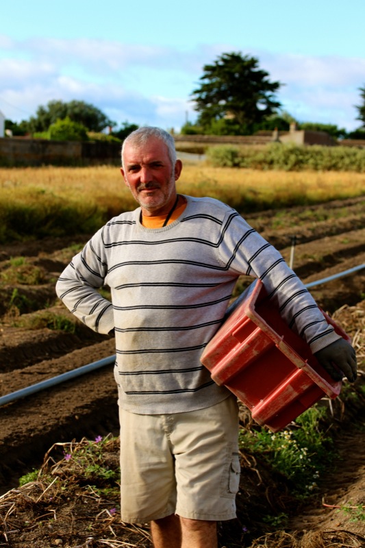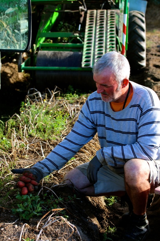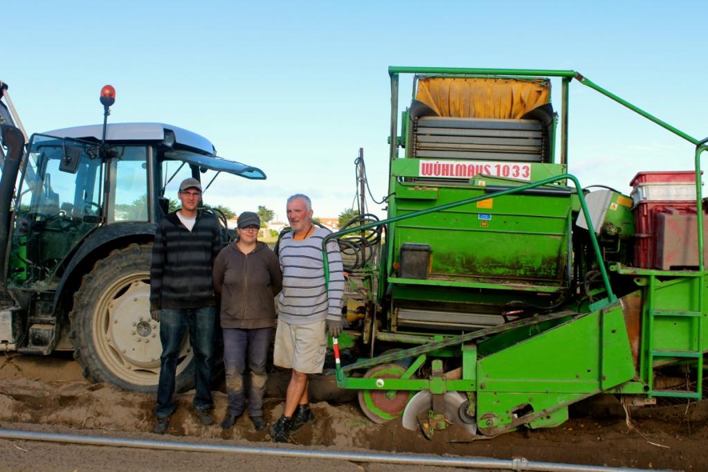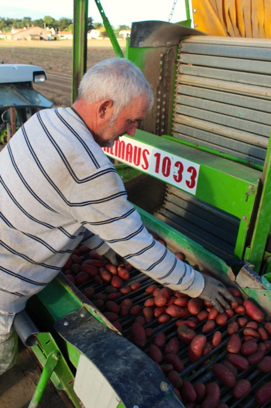Es ist 08:30h auf der französischen Insel Noirmoutier. Nebel liegt über den Feldern. Die Sonne steht noch tief, Möwen kreischen über dem Himmel. Es ist ein besonderer, bewegender Moment für Jean-Pierre Tessier und für mich. Für Jean-Pierre ist es an diesem Morgen die Ernte seiner letzten Kartoffeln und für mich ist es die Ehre dabei sein zu dürfen. Die Ernte seiner Roseval. Ihre rote Farbe wirkt anziehend auf das kulinarische Herz. Nicht nur wegen ihrer außergewöhnlich leuchtenden Farbe, sondern auch auf Grund ihres tollen Geschmacks. Für mein Knollenpüree habe ich sie in der Kombination mit Topinambur bereits öfters verwendet. Auf der Insel Noirmoutier gedeiht die Kartoffel in einem außergewöhnlichen Meeresklima. Nicht nur in der salzigen Luft, sondern auch im Boden liegt das Geheimnis ihres besonderen Aromas. Im Frühjahr sammeln die Bauern Algen am Strand und düngen damit ihre Kartoffelfelder. Solche Wachstumsbedingungen sind auf dieser französischen Insel einmalig. Also hinauf auf die „Wühlmaus“! Eine deutsche Maschine. Ich muss schmunzeln. Welch ein schönes Zeichen deutsch-französischer Zusammenarbeit... Langsam arbeitet sich der Traktor nach vorne, das Förderband rattert und befördert Knolle für Knolle aus dem Sandboden...