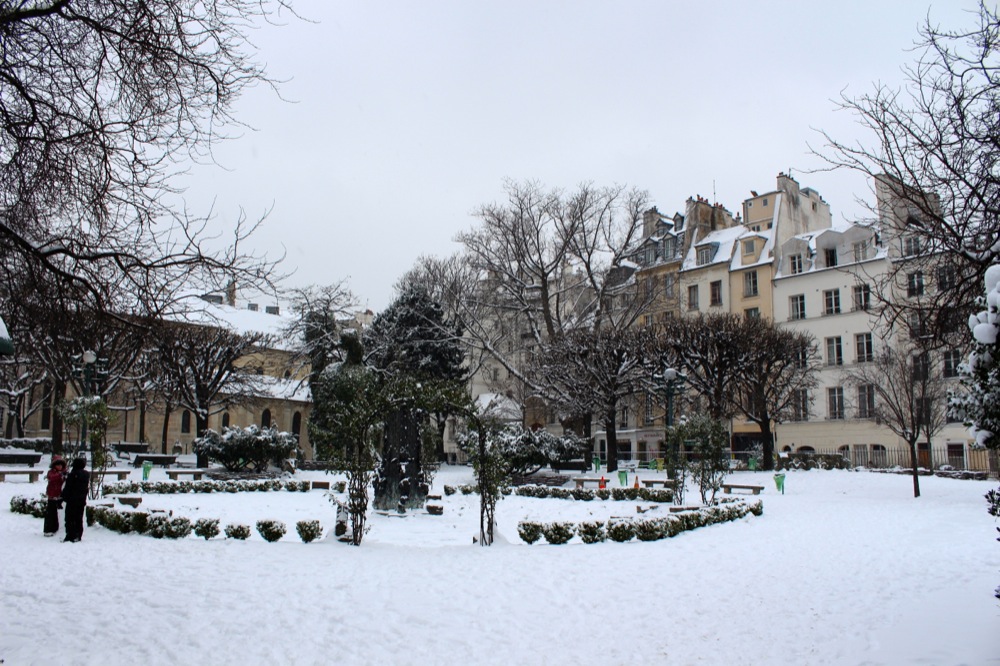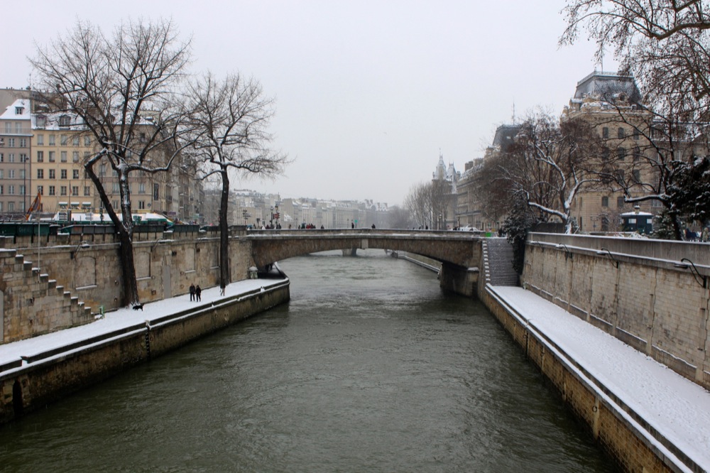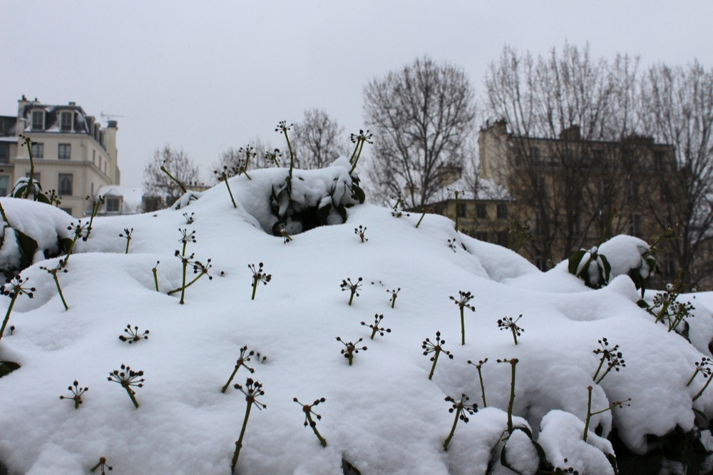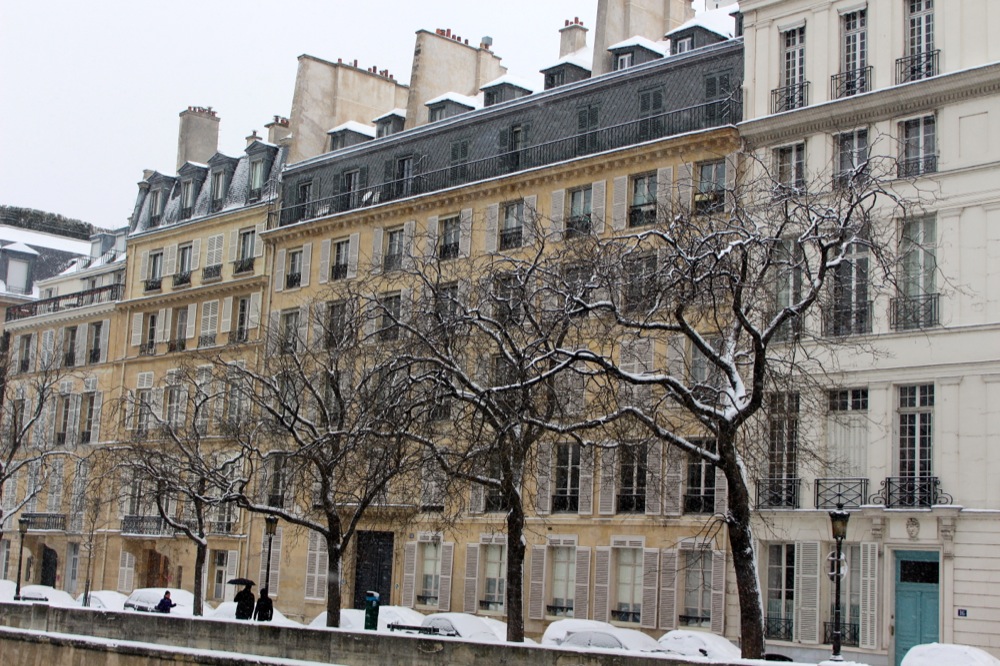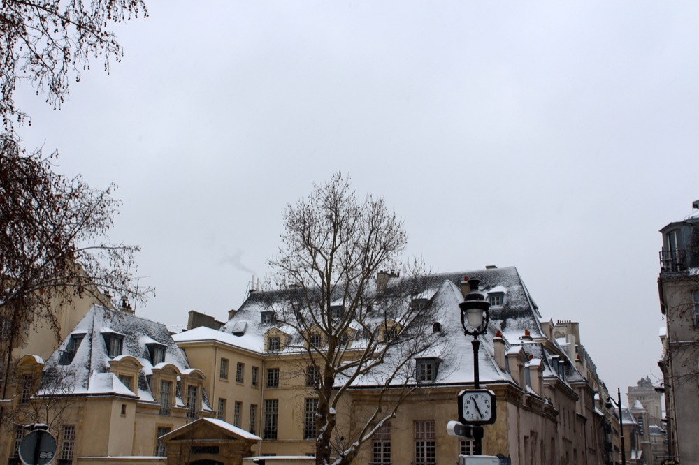 An diesem Sonntag im Januar bedeckt eine wunderbare Schneedecke die Häuser dieser Stadt. Warm angezogen mache ich mich in den Morgenstunden auf den Weg für einen langen Winterspaziergang an der Seine entlang. Auf der Ile Saint Louis läuten die Glocken für den Gottesdienst. Großmütter, verliebte Paare, Familien, Kinder in Schottenröcken und bunten Gummistiefeln stapfen eilig durch die verschneiten Gassen. Schnell die kleine Stiege hinauf ins Warme. Drinnen heimlich die nassen Stiefel auf dem warmen Gebläse aus dem Kirchenboden aufwärmen und dabei dem Halleluja lauschen...