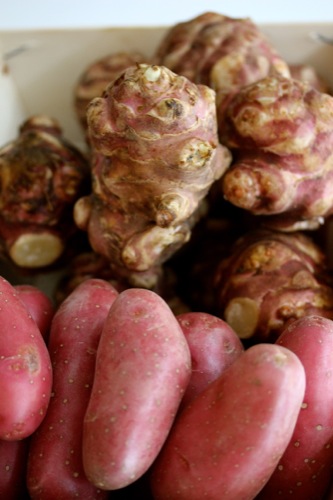 Während das Huhn im Ofen brät, widme ich mich dem Knollenpüree aus Topinambur und Kartoffel. In der Provençale habe ich mich für die französische Kartoffel Roseval entschieden. In Frankreich ist die länglich ovale Knolle seit 1950 für ihren außerordentlich cremigen Geschmack bekannt. Sie eignet sich für die Kombination mit Topinambur ganz hervorragend.
