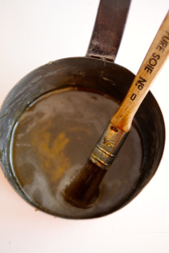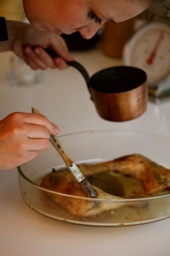 Eine viertel Stunde bevor die Hähnchenschlegel fertig sind, nehme ich sie kurz heraus und bestreiche sie mit Honig. Die Haut wird dann wunderbar knusprig.