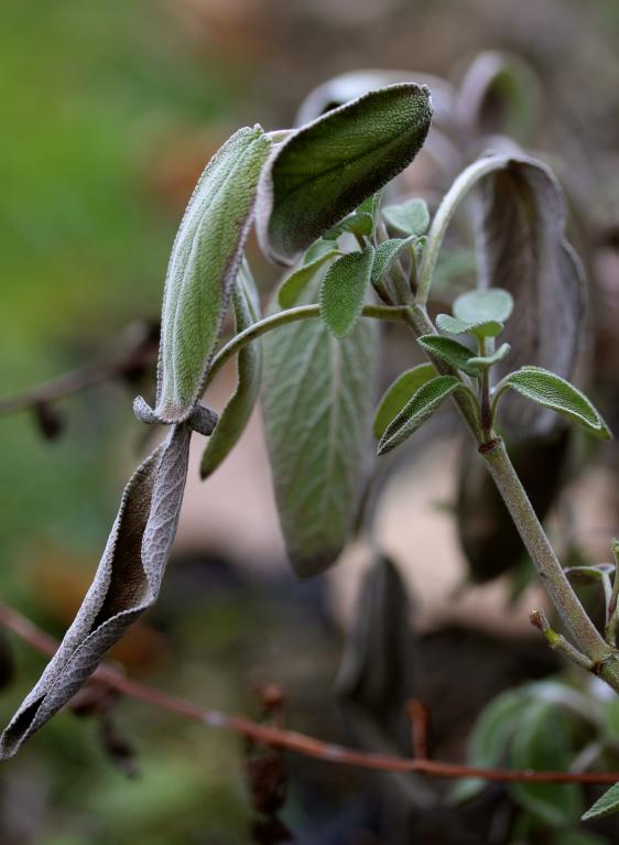 Salbei und Thymian wachsen bei uns im Garten. Sie sind eine der wenigen Kräuter, die den Winter überlebt haben. Die neuen grünen Blätter am Salbeistrauch kündigen zusammen mit den Schneeglöckchen den Frühling an.
